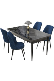 Transforme sua sala de jantar em um espaço elegante e convidativo com nosso Conjunto de Mesa e Cadeiras de Jantar de 5 peças. Feito com 100% de aglomerado revestido de melamina e pernas de metal robustas, este conjunto exala elegância e durabilidade. A mesa de jantar em mármore preto elegante adiciona um toque de sofisticação, enquanto as cadeiras azul-marinho com estofamento em tecido Jerry proporcionam conforto e estilo.