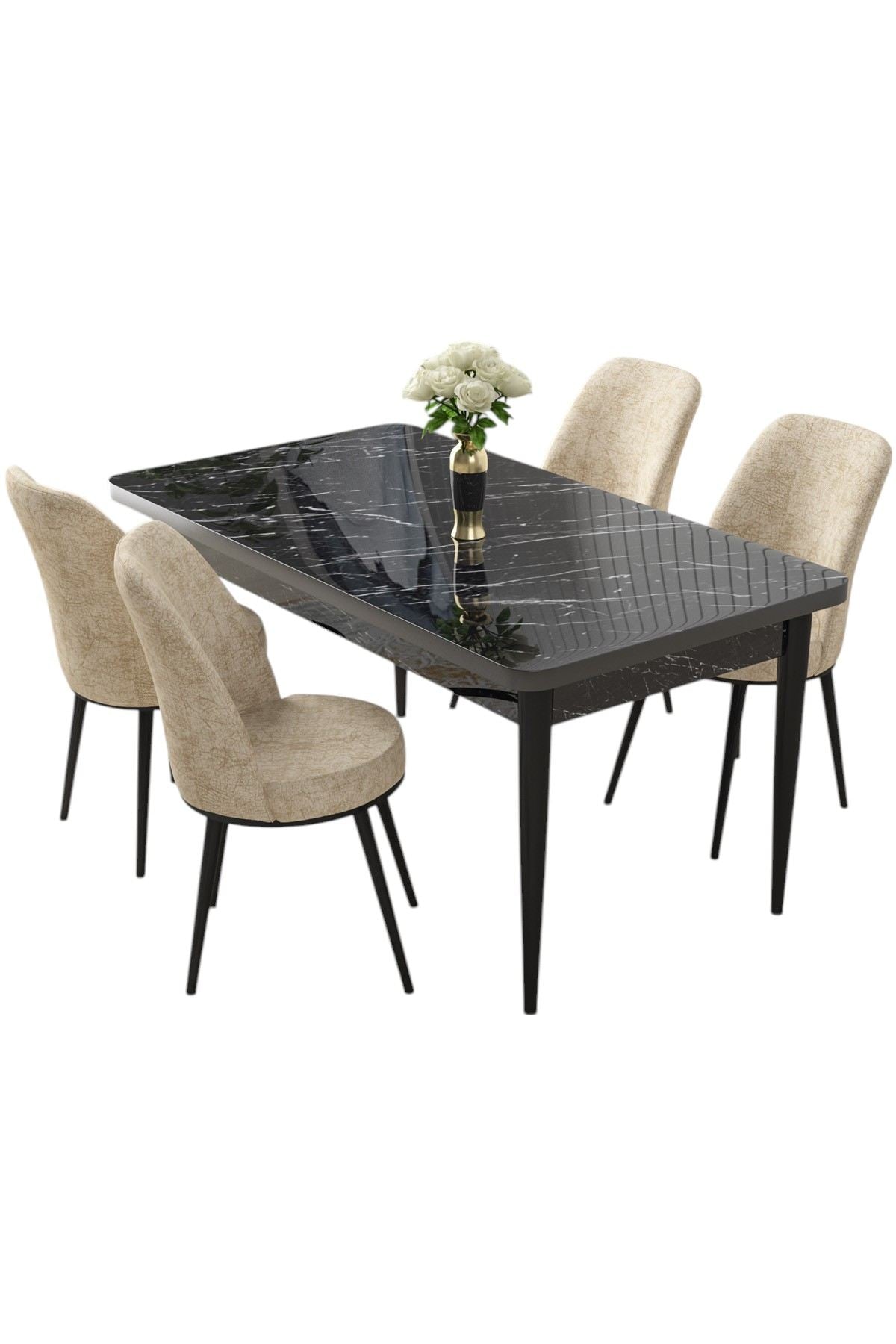 - Cor: Tampo de Mesa de Mármore Preto, Cadeiras Creme