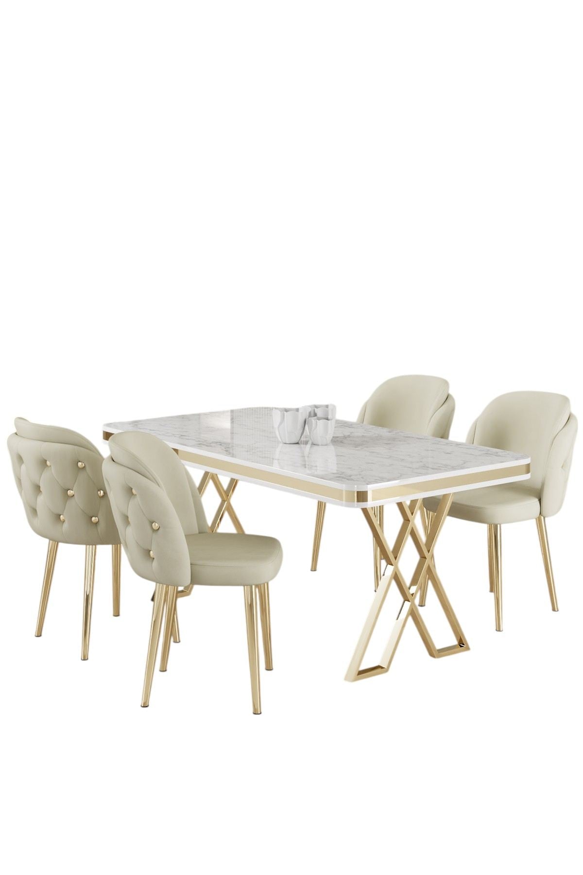 Conjunto de Mesa de Jantar e Cadeiras – 130cm x 74cm x 80cm – Branco, Dourado, Creme – Painel Laqueado, Metal, Compensado