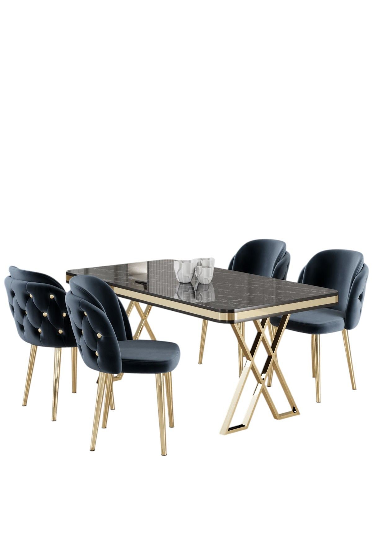Este conjunto está disponível em uma combinação de cores sofisticadas: Mármore Preto, Ouro e Antracite, adicionando um toque de luxo à decoração da sua sala de jantar. O design elegante e a paleta de cores moderna fazem deste conjunto uma adição perfeita para qualquer lar contemporâneo.