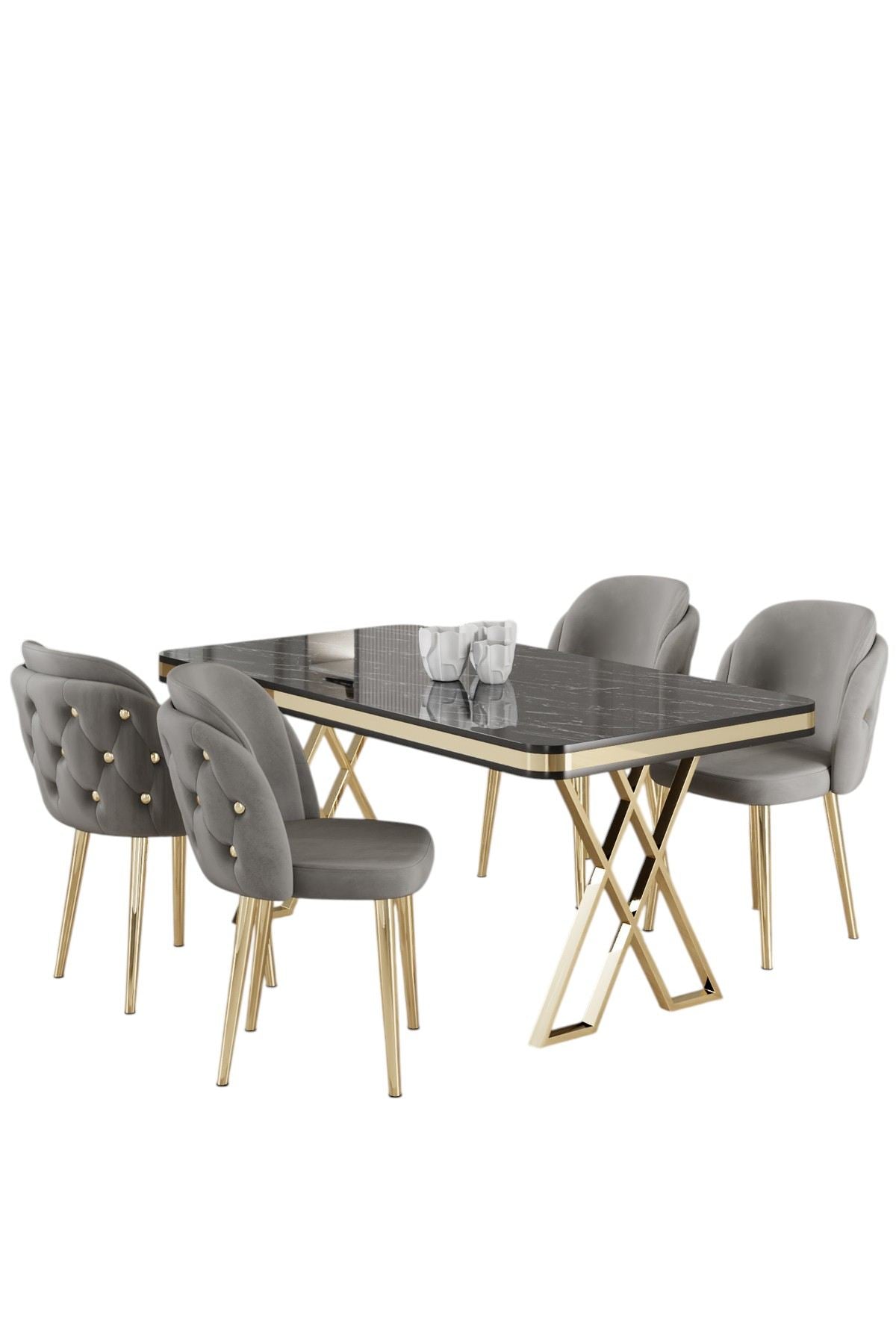 A mesa de jantar apresenta um elegante tampo de mármore preto com detalhes em dourado, adicionando um toque de glamour ao seu espaço. As cadeiras vêm em uma cor cinza chique que complementa a mesa de forma linda. Com seu design moderno e materiais de alta qualidade, este conjunto certamente impressionará seus convidados e elevará sua experiência de jantar.