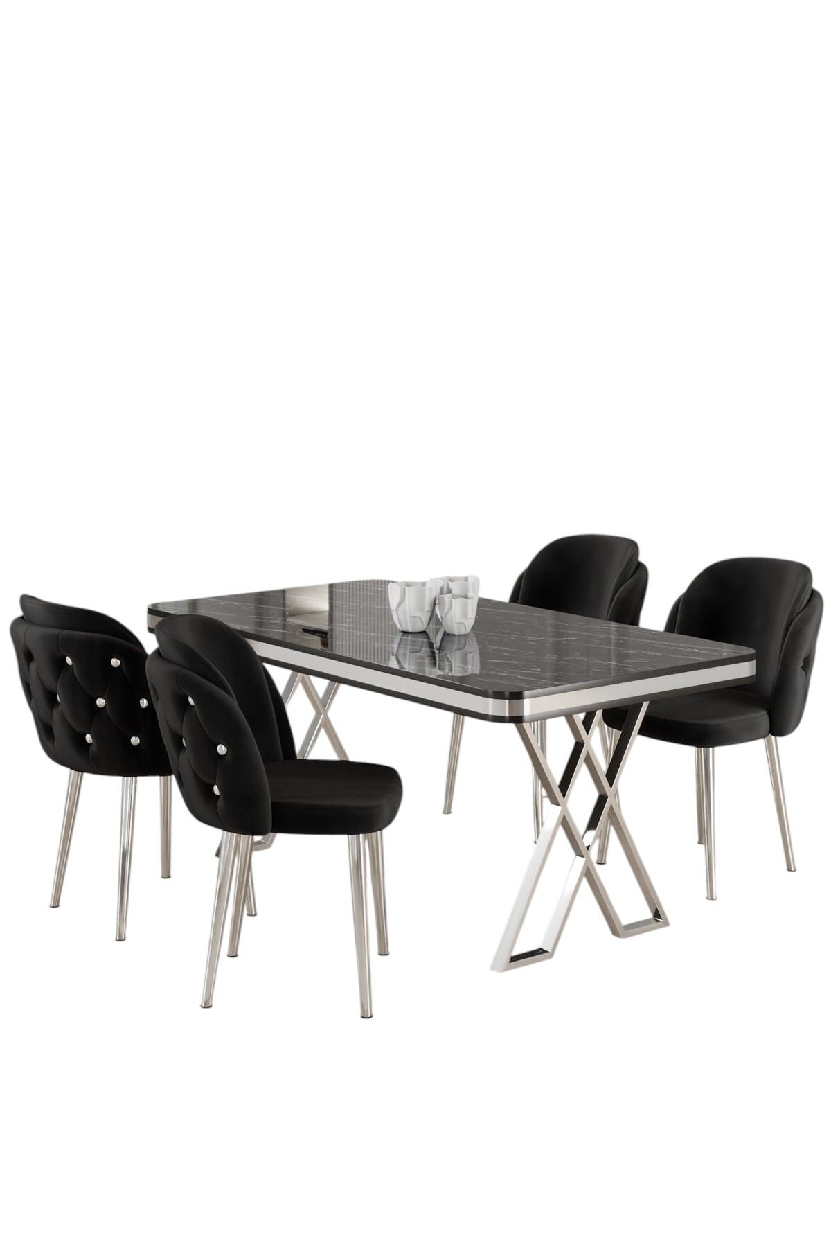 A mesa de jantar apresenta um elegante tampo de mármore preto com detalhes em cromo, adicionando um toque de glamour ao seu espaço. As cadeiras são projetadas com um estilo contemporâneo, com uma cor preta chique que complementa qualquer estilo de decoração. O conjunto inclui 1 mesa de jantar e 4 cadeiras, perfeito para reuniões familiares ou jantares com amigos.