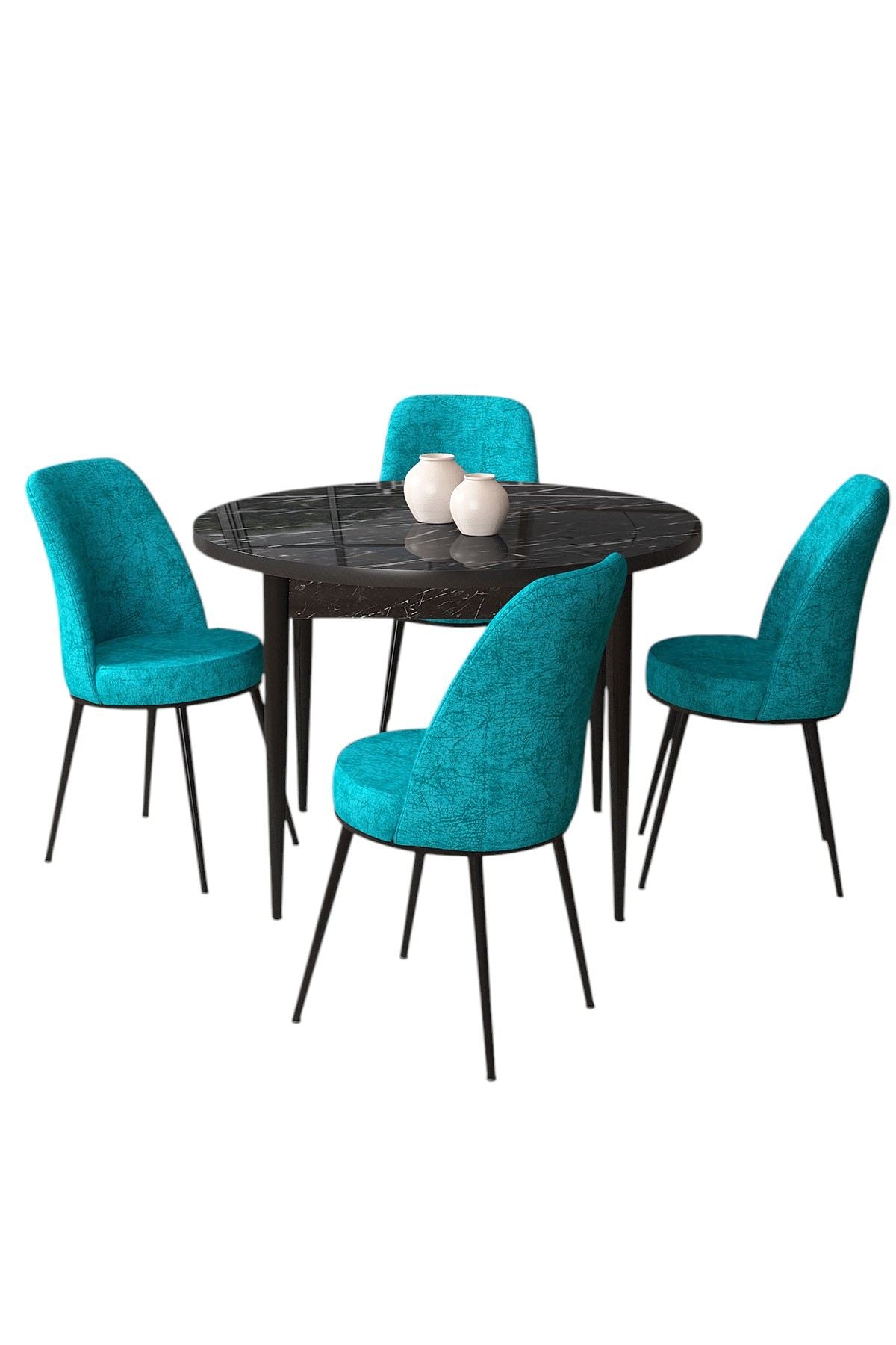 Conjunto de Mesa de Jantar e Cadeiras – 90x75x90 cm – Mármore Preto e Turquesa – Aglomerado e Metal