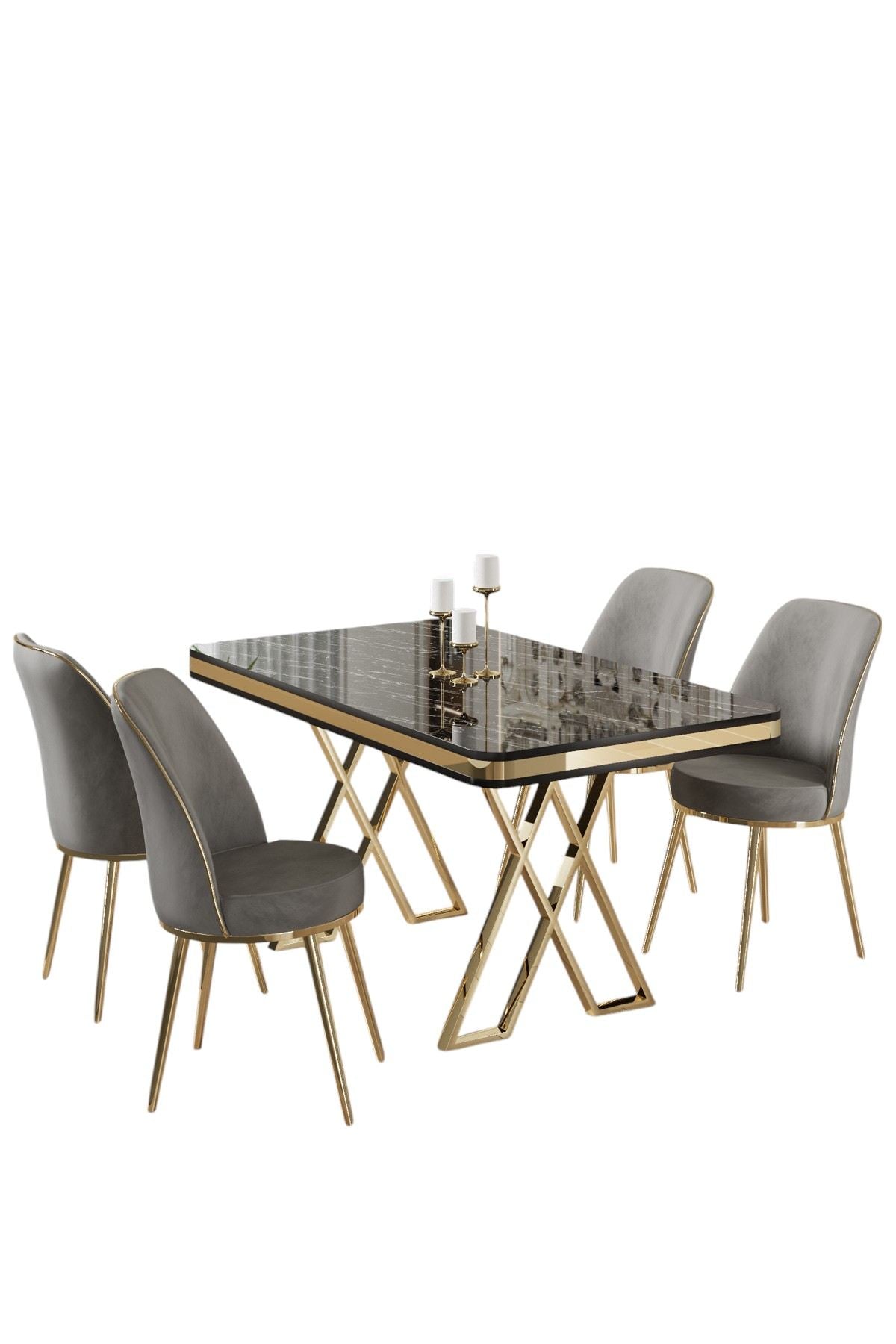 Conjunto de mesa de jantar e cadeiras – 130 cm x 80 cm – Mármore Preto, Dourado, Cinza – Metal