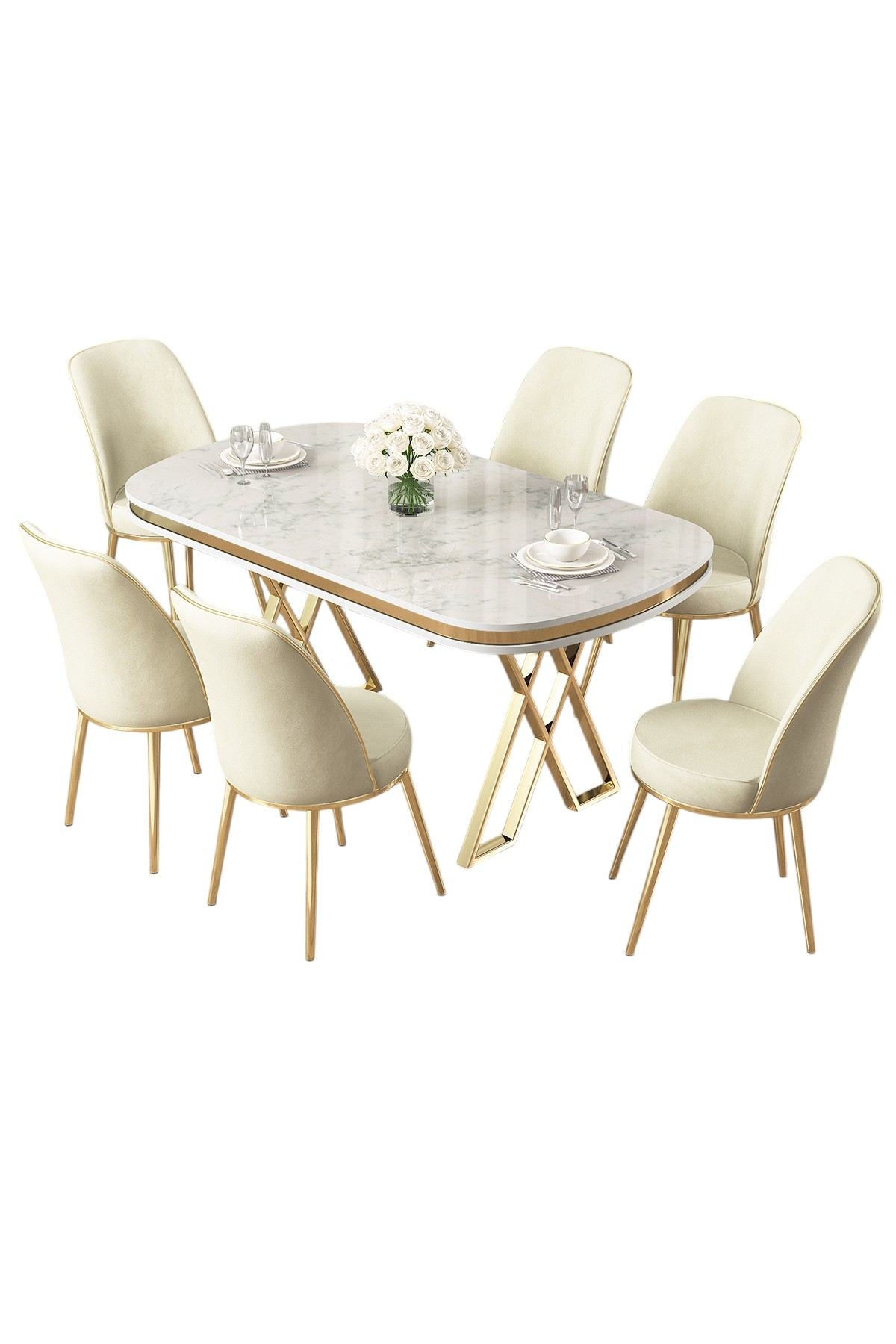 Conjunto de mesa de jantar e cadeiras – 168 cm x 76 cm x 90 cm – Branco, Dourado, Creme – Painel laqueado, Metal