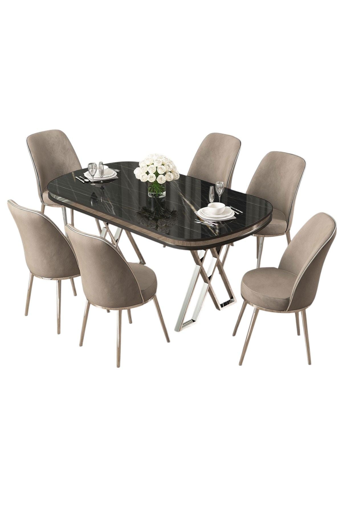 Conjunto de mesa de jantar e cadeiras – 168 cm x 76 cm x 90 cm – Mármore Preto, Cromado, Cappuccino – Metal