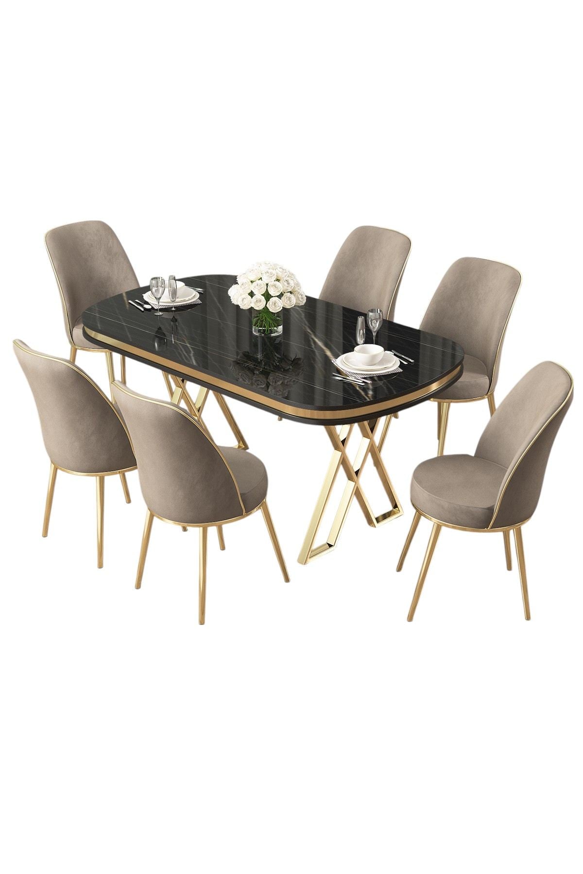 Conjunto de mesa de jantar e cadeiras (7 peças) – Dimensões da Mesa: 168 cm x 76 cm x 90 cm – Mármore Preto, Dourado, Cappuccino – Painel laqueado, Metal, Tecido Babyface