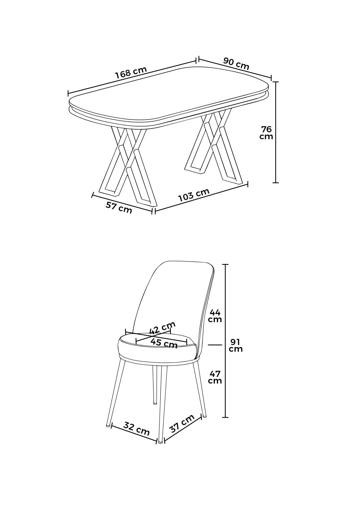- Dimensões da Mesa: Largura 168 cm, Altura 76 cm, Profundidade 90 cm