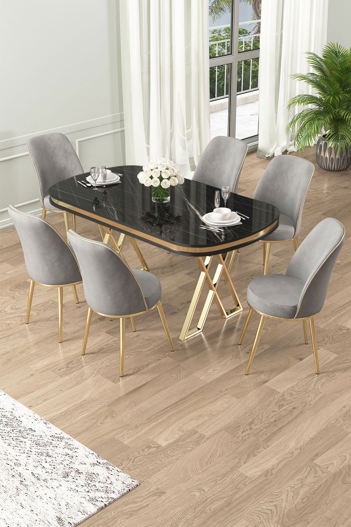 Conjunto de mesa de jantar e cadeiras – 168x90 cm – Mármore Preto, Dourado, Cinza – Metal e Painel Laqueado