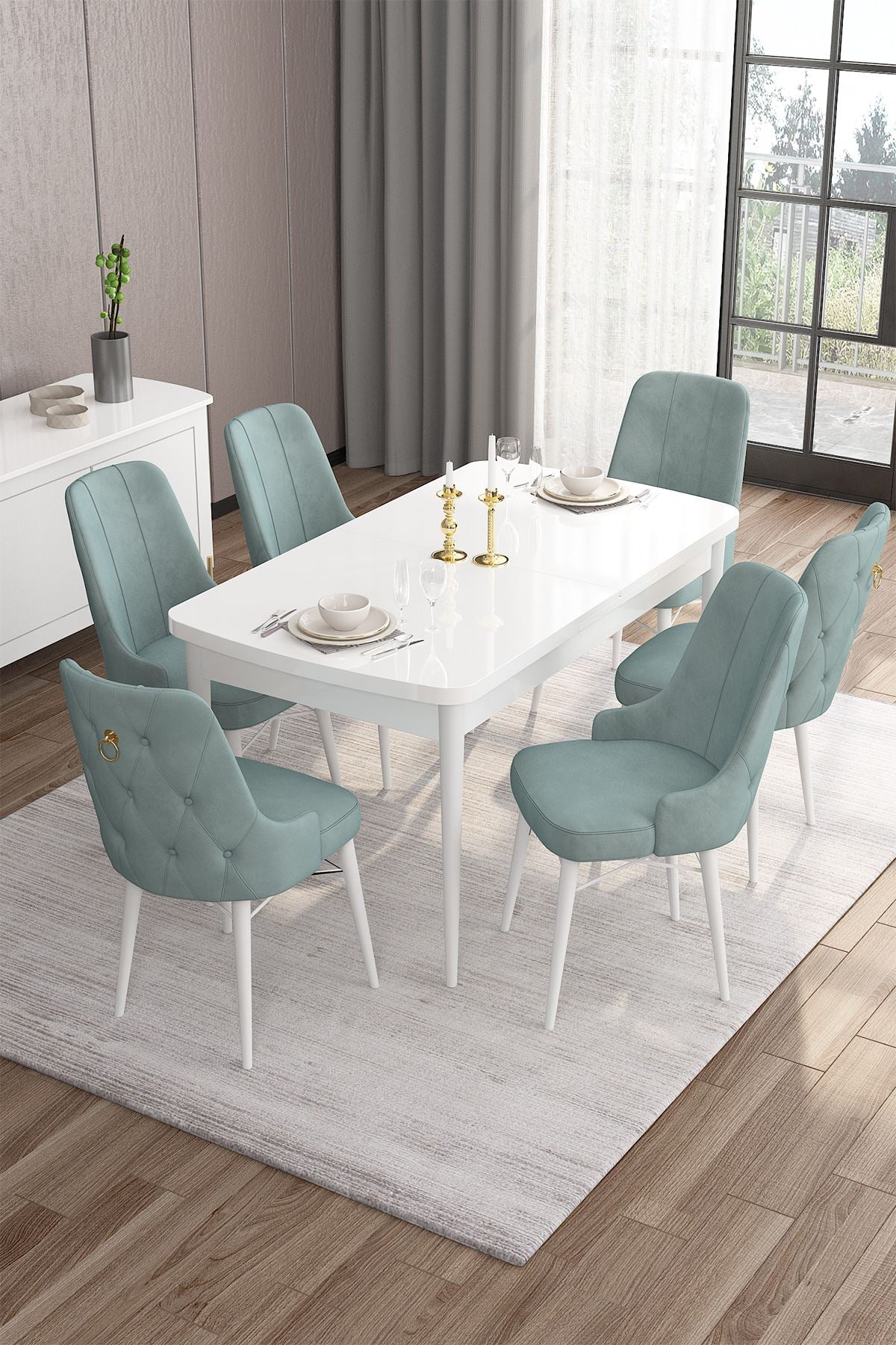 A mesa de jantar apresenta um acabamento branco elegante, enquanto as cadeiras são estofadas em um luxuoso tecido verde-marinho, criando um visual harmonioso e chique. O recurso extensível da mesa permite acomodar mais convidados confortavelmente, tornando-a ideal para reuniões familiares e jantares.