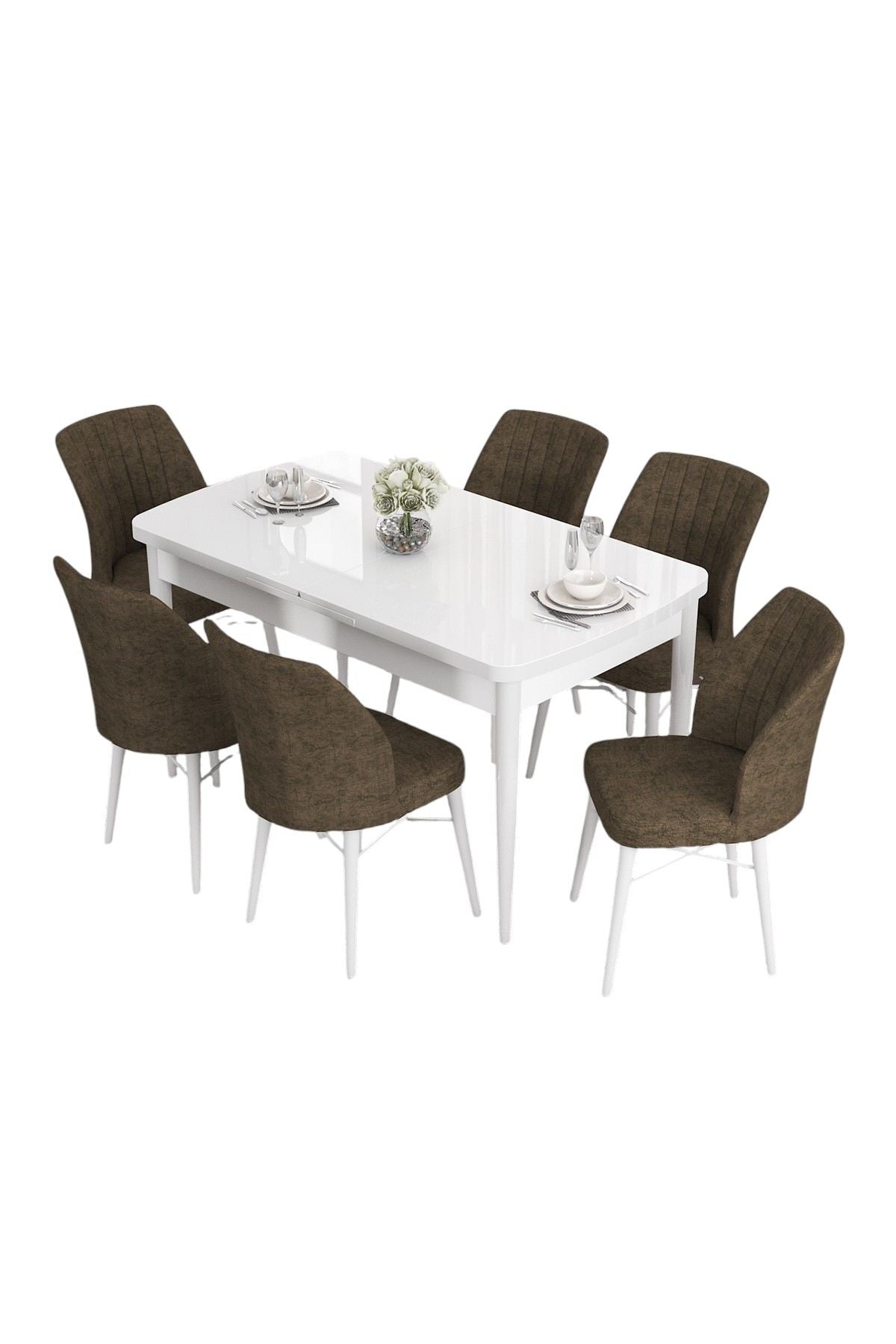 Conjunto de mesa de jantar extensível e cadeiras (7 peças) – 132x78x80 cm (aberta: 170 cm) – Branco e Marrom – MDF e metal