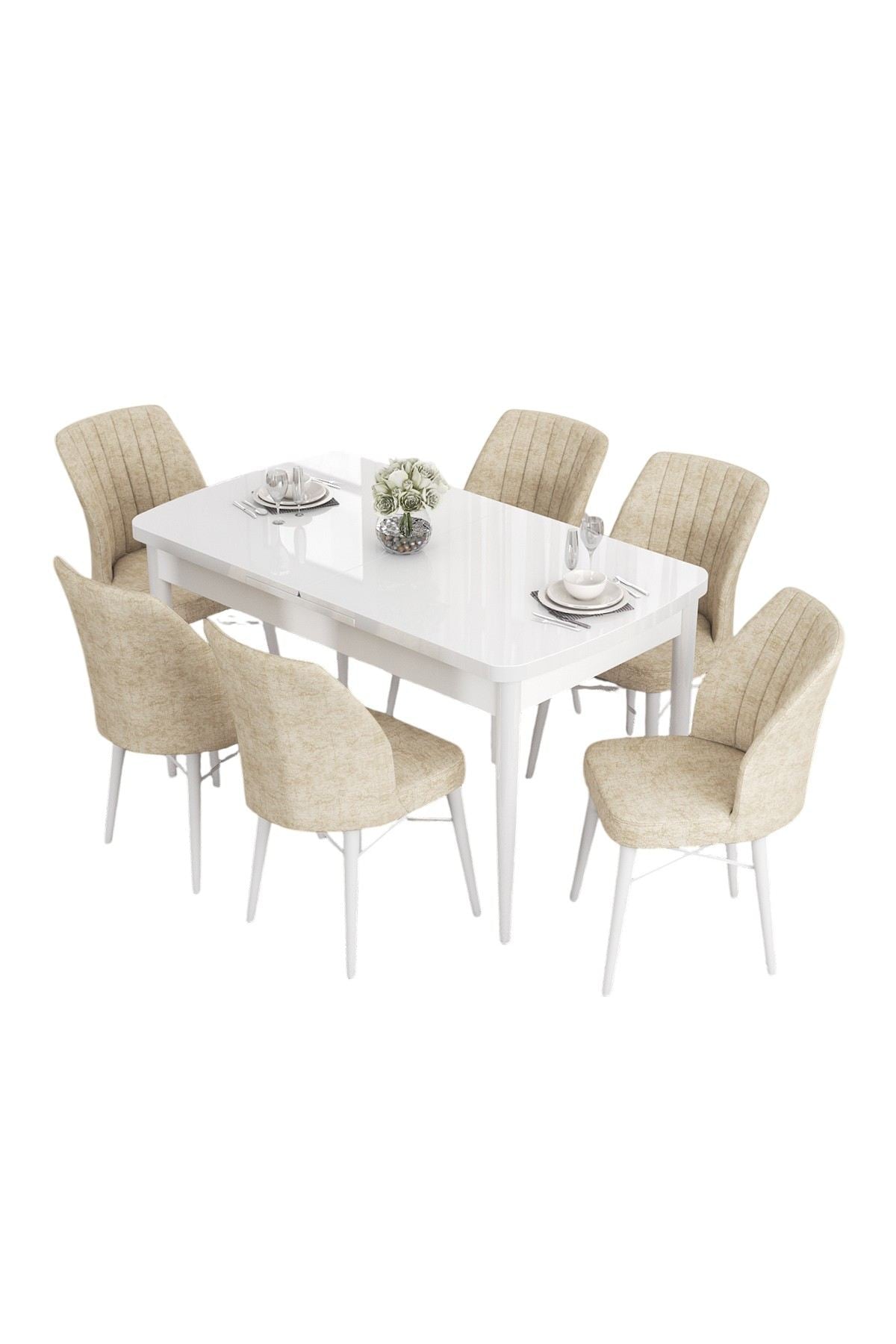 Conjunto de Mesa de Jantar Extensível e Cadeiras – 132 cm a 170 cm – Branco e Creme – MDF, Metal e Madeira
