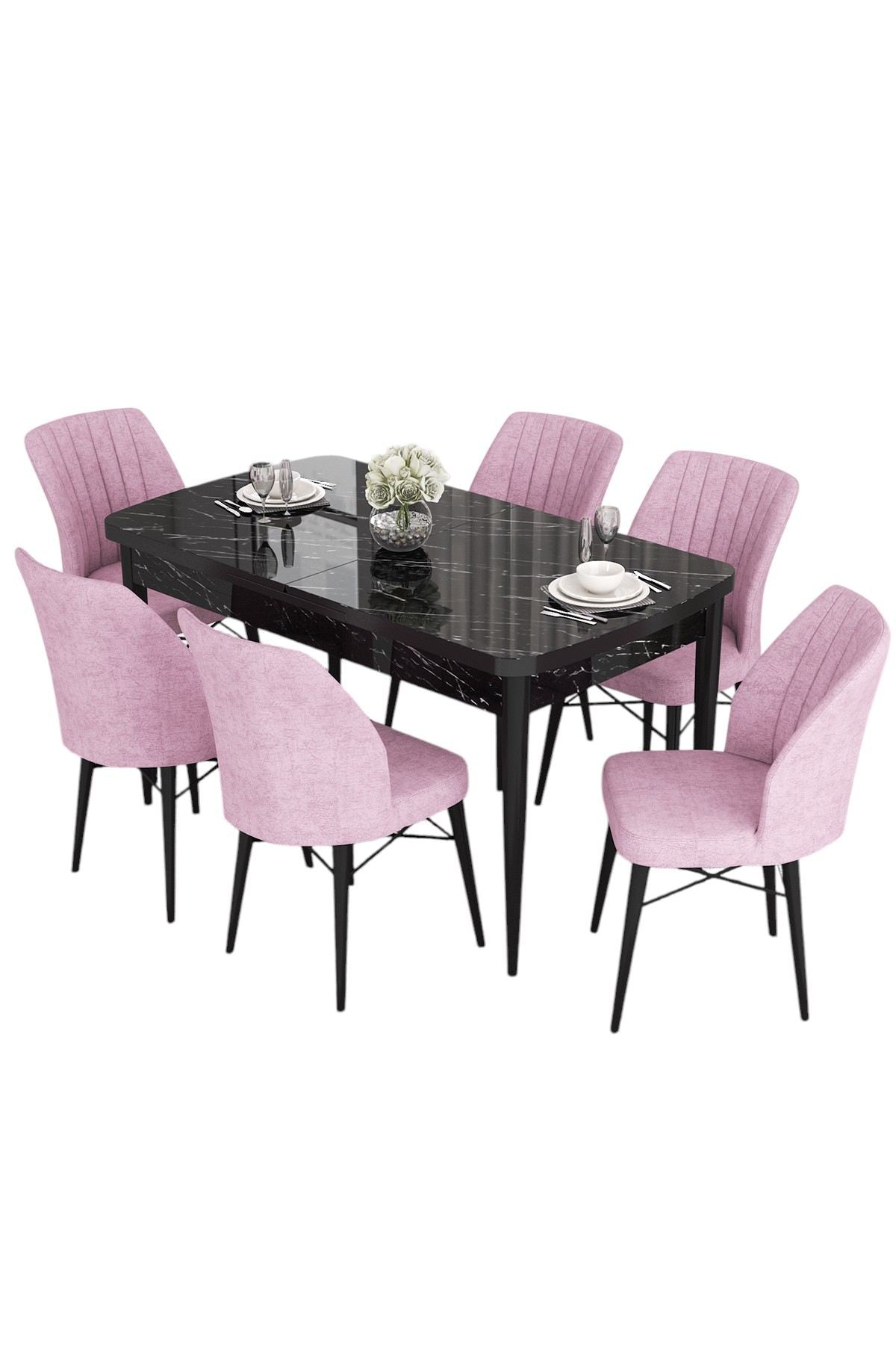 Conjunto de mesa de jantar extensível e cadeiras – 132 cm x 78 cm x 80 cm – Preto Mármore e Rosa – MDF e metal