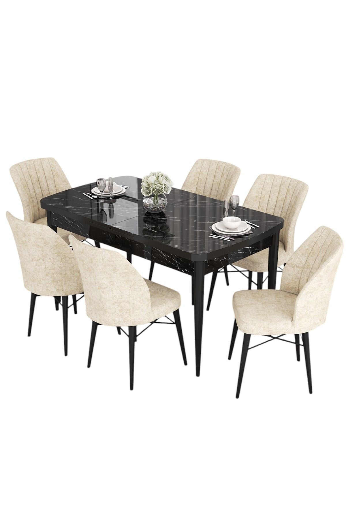 Conjunto de Mesa de Jantar Extensível e Cadeiras – 132x80x78cm – Mármore Preto e Creme – MDF e Metal