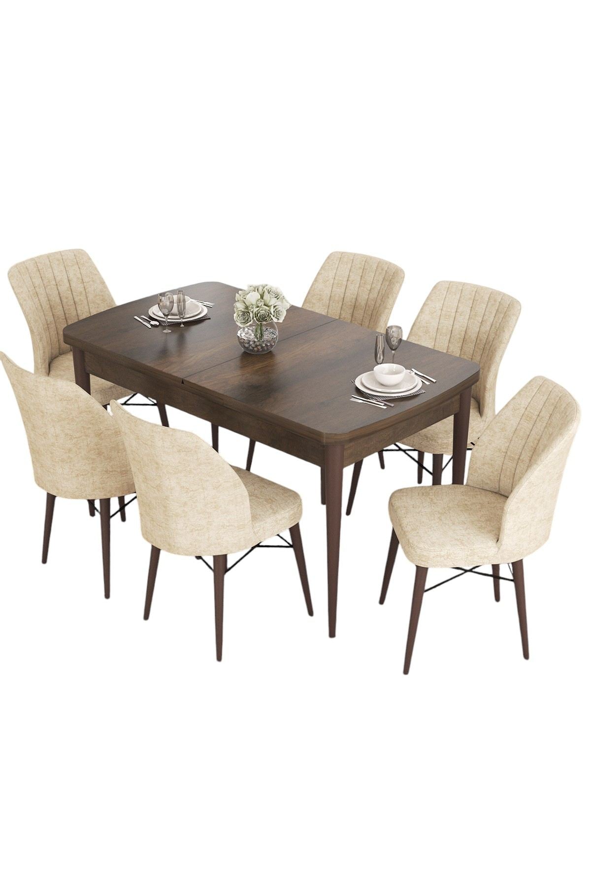 Conjunto de mesa de jantar extensível e cadeiras (7 peças) – 132 cm a 170 cm largura – Creme – MDF e metal com pernas de madeira