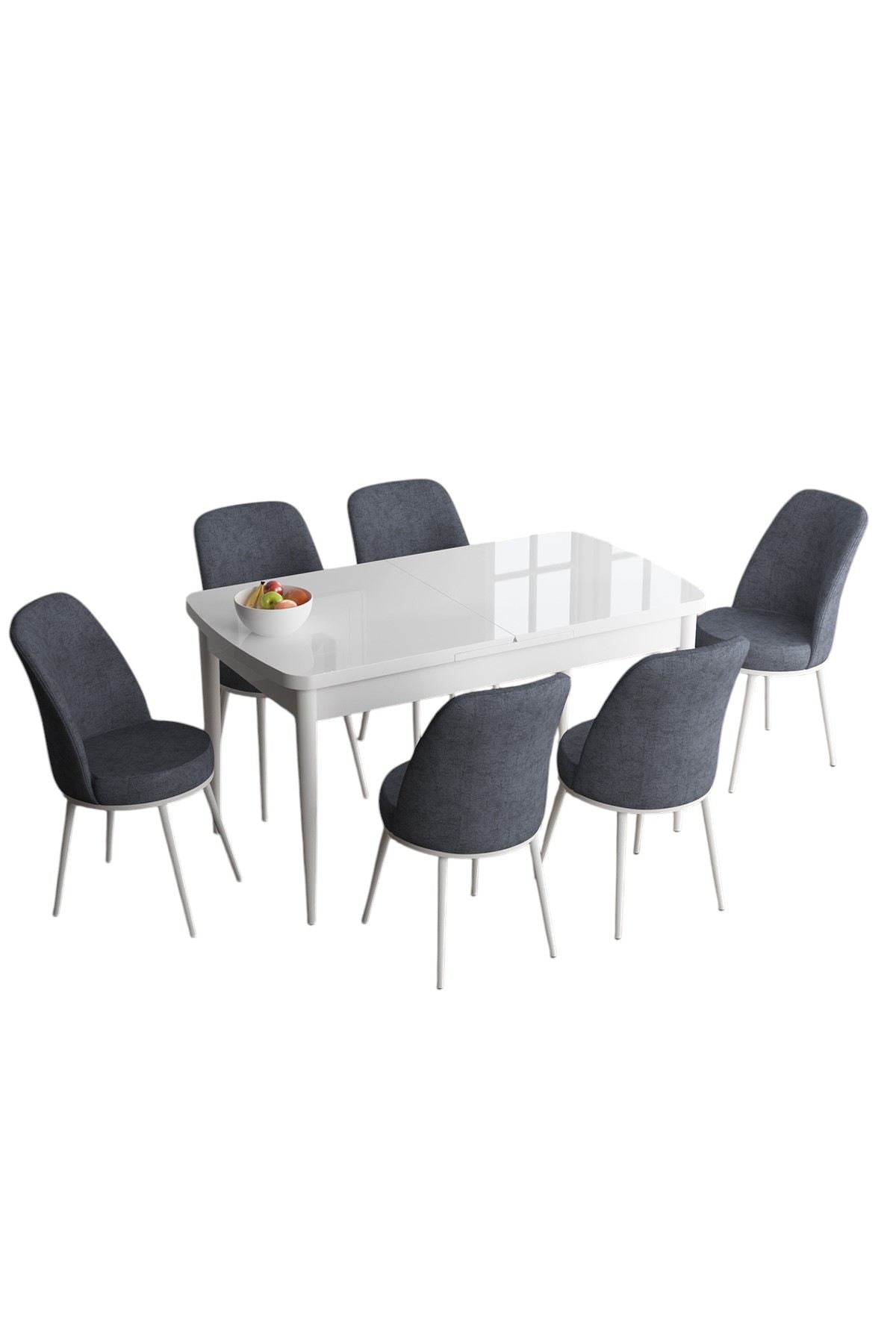 Conjunto de Mesa de Jantar Extensível e Cadeiras (7 Peças) – 114/144x70x78 cm – Branco e Fumê – MDF e Metal
