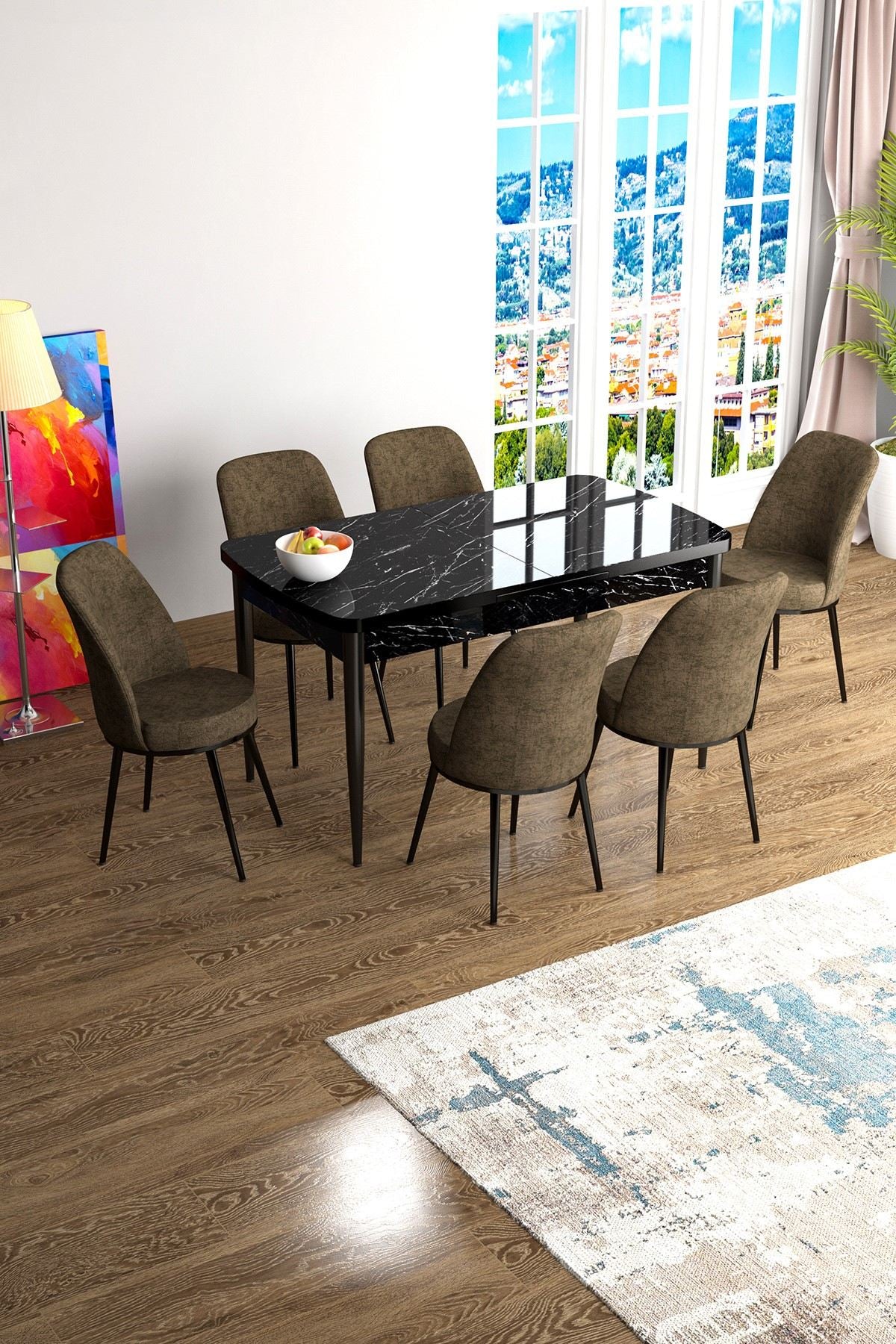 Conjunto de mesa de jantar extensível e cadeiras – 114 cm x 78 cm x 70 cm / 144 cm x 78 cm x 70 cm – Preto Mármore e Marrom – MDF e metal