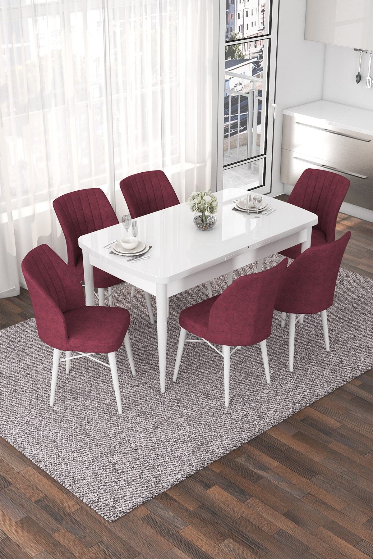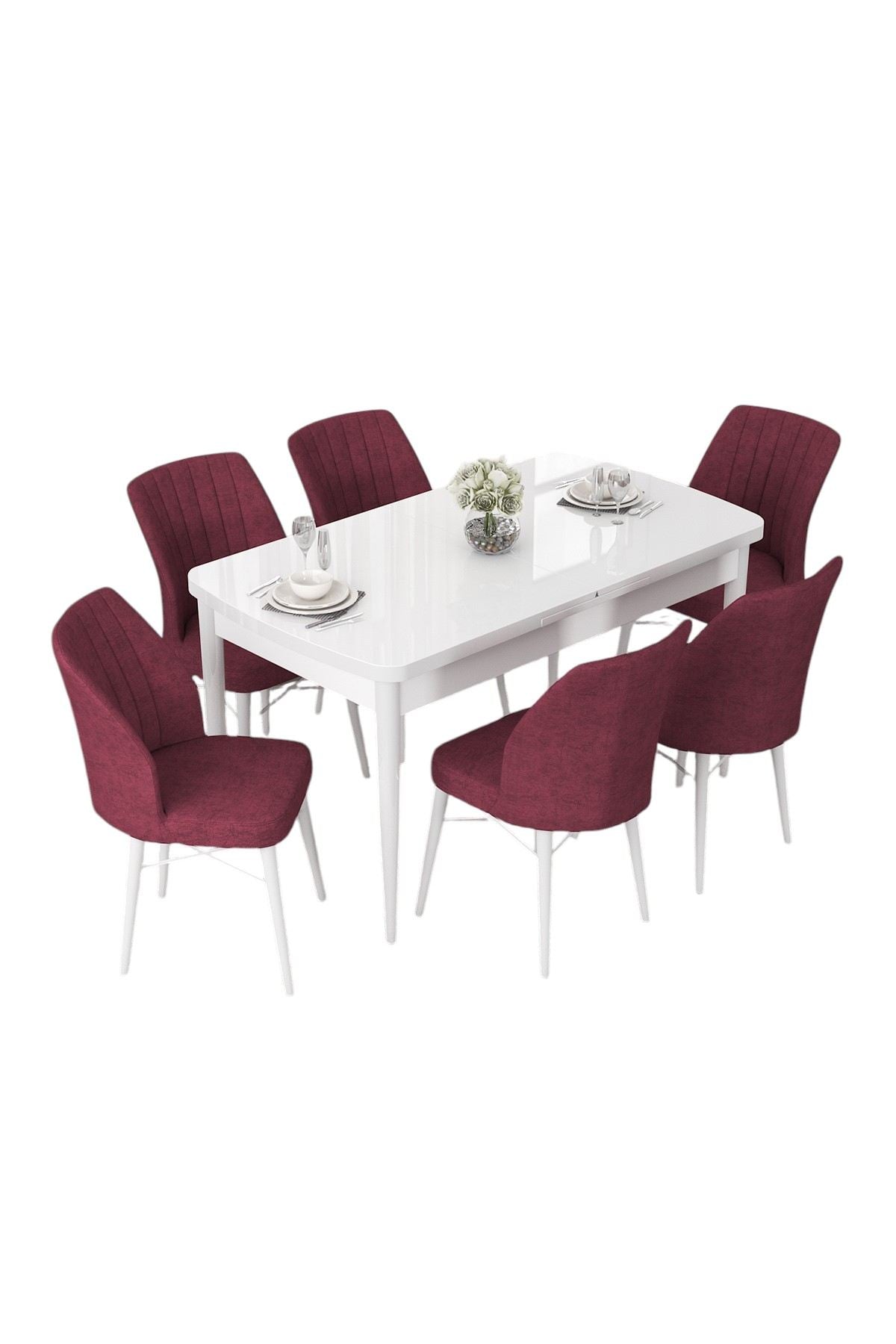 Conjunto de Mesa de Jantar Extensível e Cadeiras (7 Peças) – 114x70 cm (Mesa) – Branco e Bordô – MDF e Madeira