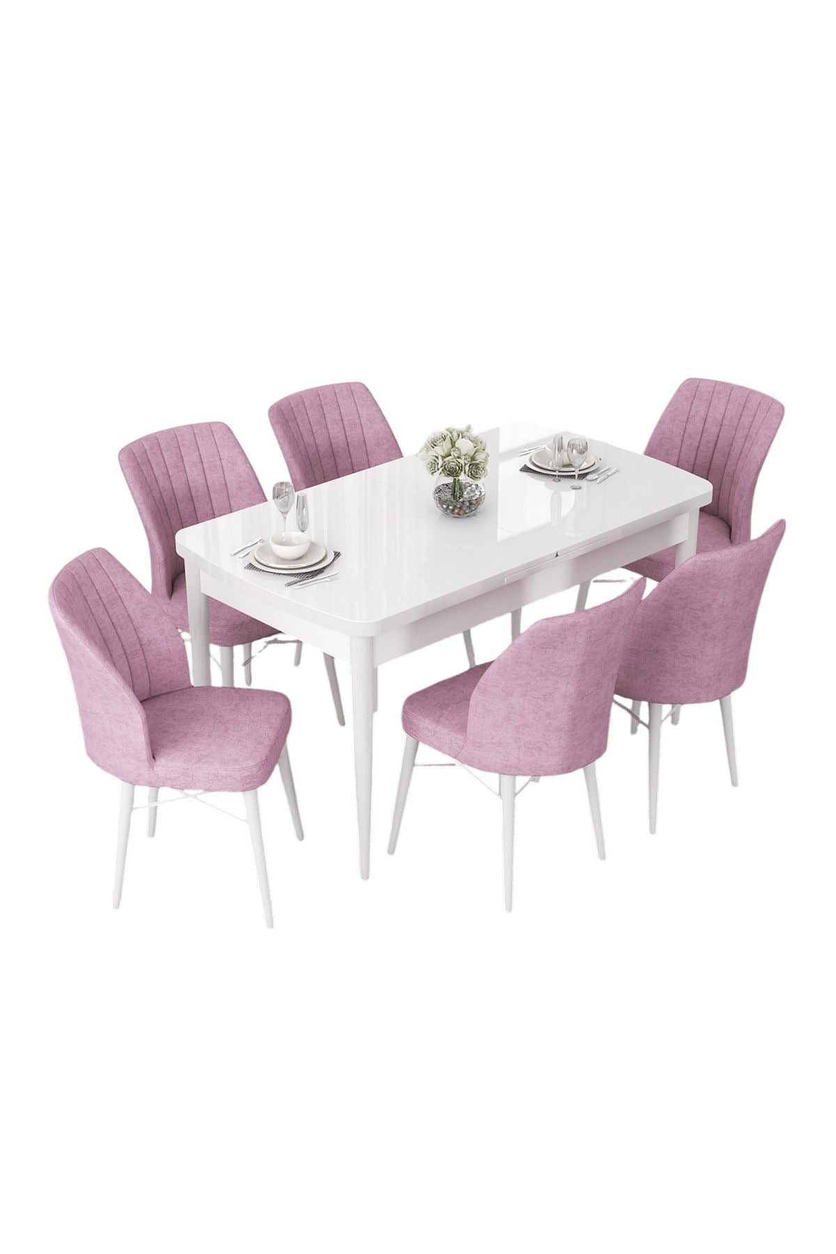 Conjunto de mesa de jantar extensível e cadeiras (7 peças) – 114 cm x 70 cm x 78 cm – Branco e Rosa – MDF e Metal