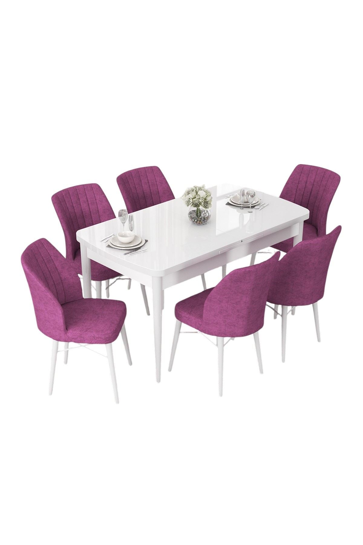 Conjunto de mesa de jantar extensível e cadeiras (7 peças) – 114 cm x 78 cm x 70 cm – Branco e Roxo – MDF com pernas de madeira
