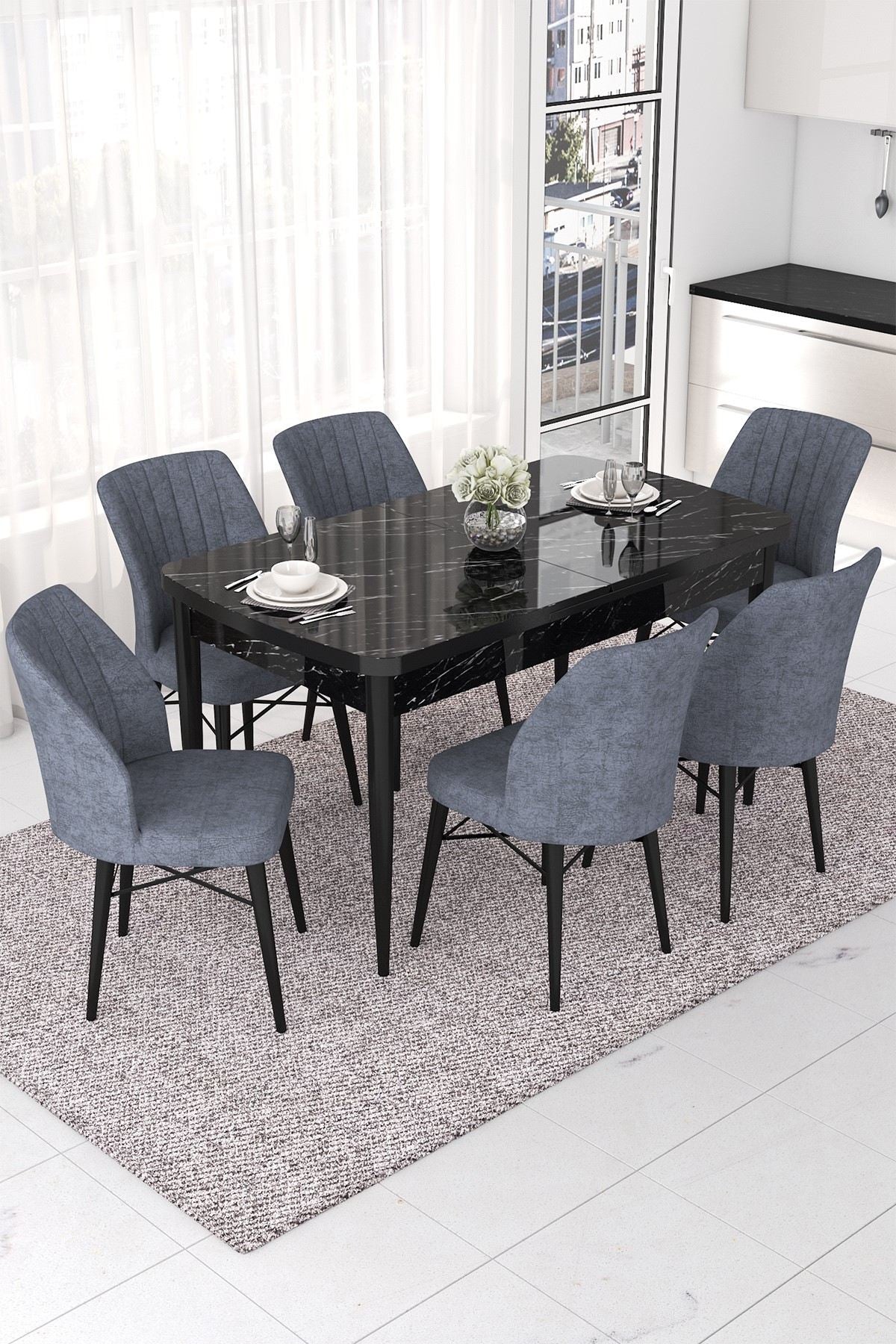 Conjunto de mesa de jantar extensível e cadeiras (7 peças) – 114-144 cm – preto, fumaça – MDF, metal, madeira
