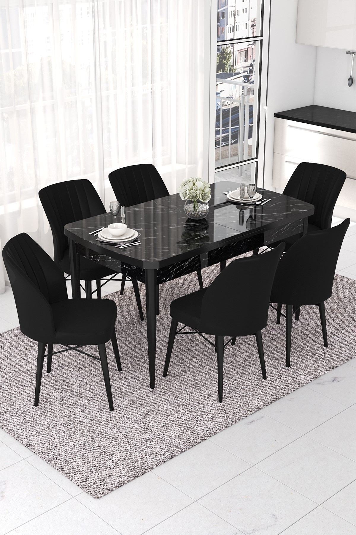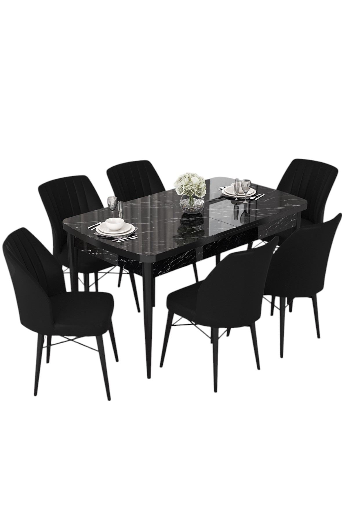 Conjunto de Mesa de Jantar e Cadeiras Extensível (7 Peças) – 114cm x 78cm x 70cm – Preto e Mármore Preto – MDF e Metal