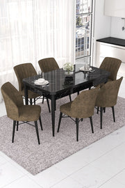 Conjunto de Mesa de Jantar Extensível e Cadeiras (7 peças) – 114 cm a 144 cm – Preto e Marrom – MDF e Metal