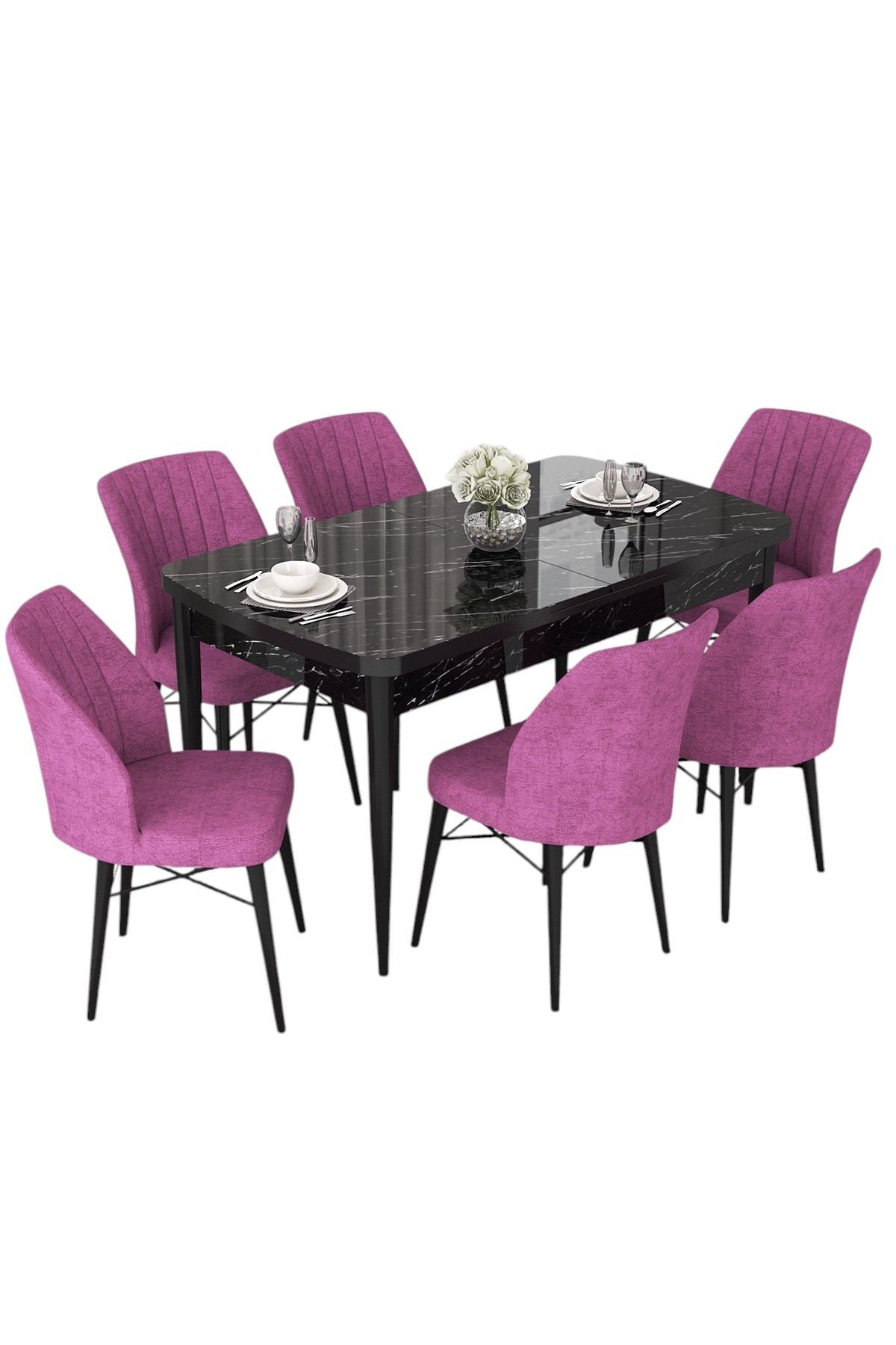 Conjunto de mesa de jantar extensível e cadeiras (7 peças) – 114 cm largura – Preto Mármore e Roxo – MDF com pernas de madeira