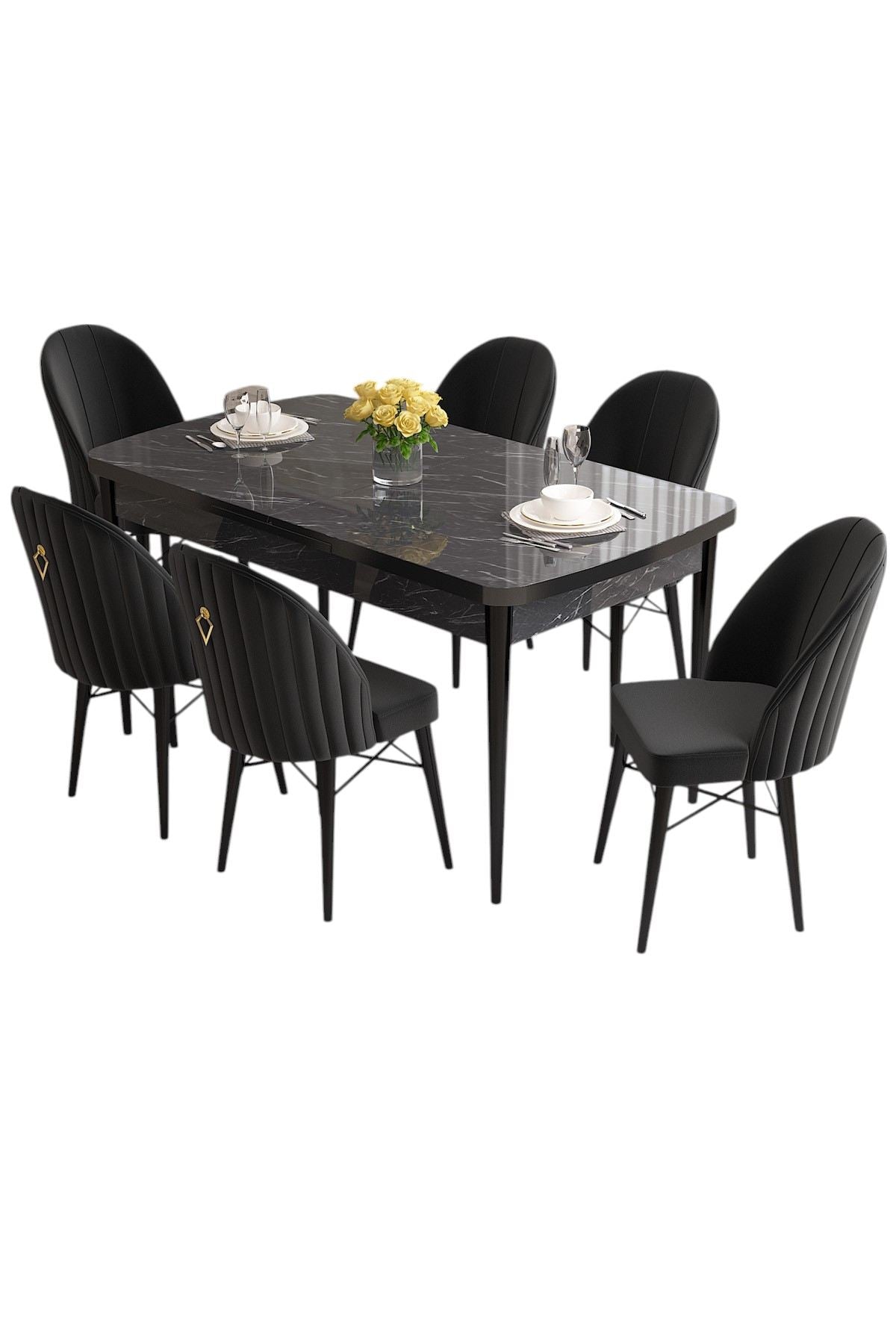 Conjunto de Mesa de Jantar Extensível e Cadeiras – 132 cm x 78 cm x 80 cm (mesa) – Mármore Preto e Preto – MDF e Metal