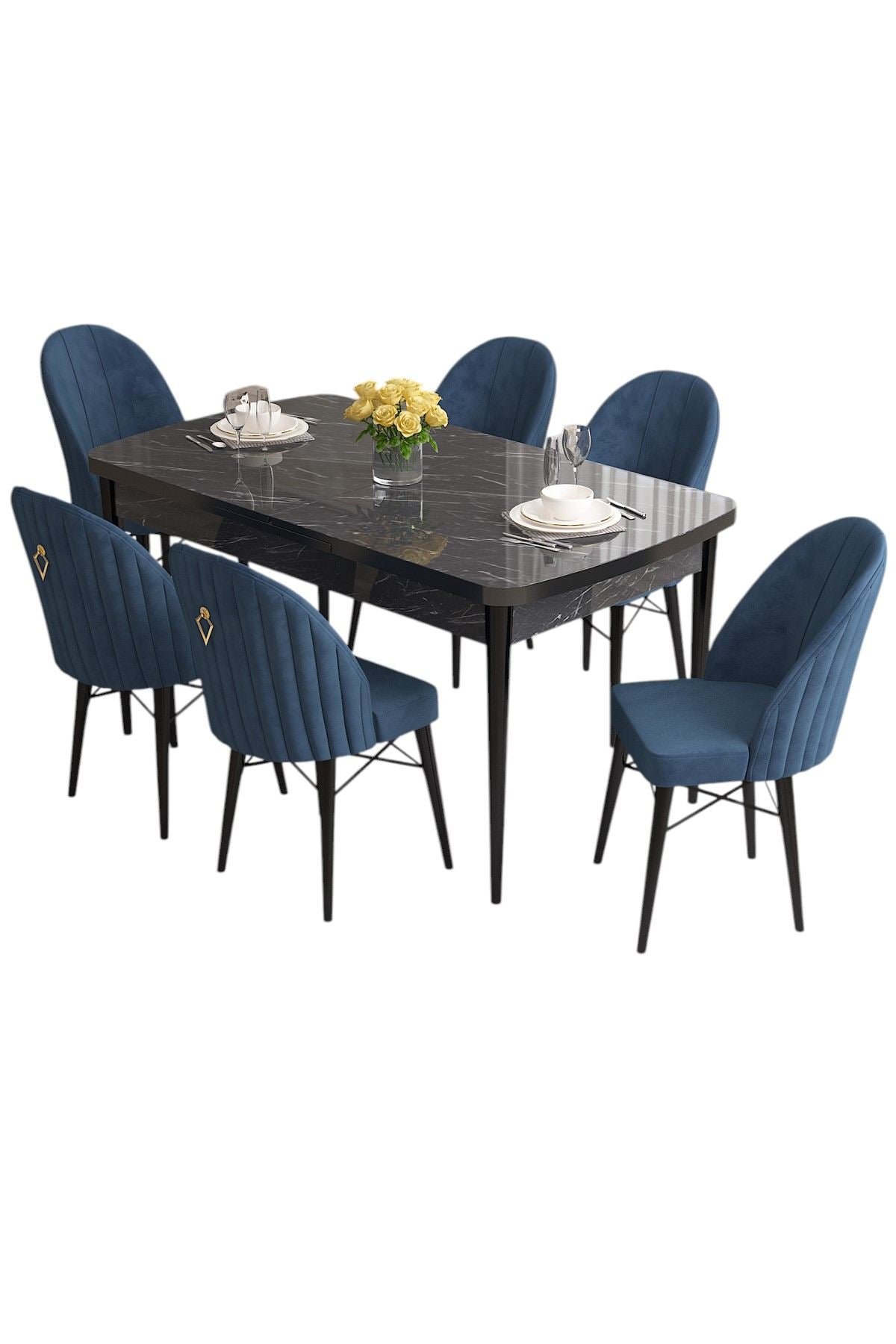 Conjunto de mesa de jantar extensível e 6 cadeiras – 132 cm x 80 cm x 78 cm – Mármore Preto e Azul Marinho – MDF e madeira