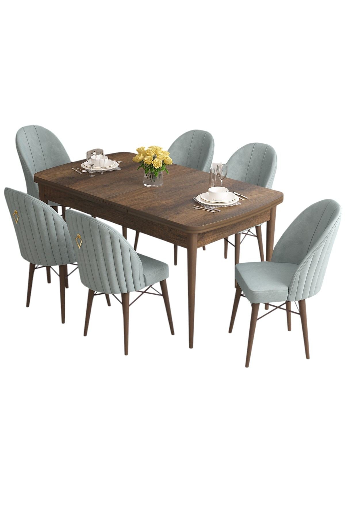 Conjunto de Mesa de Jantar Extensível e Cadeiras (7 peças) – 132x80 cm (estendida 170 cm) – Verde Mar e Barroco – MDF e Metal