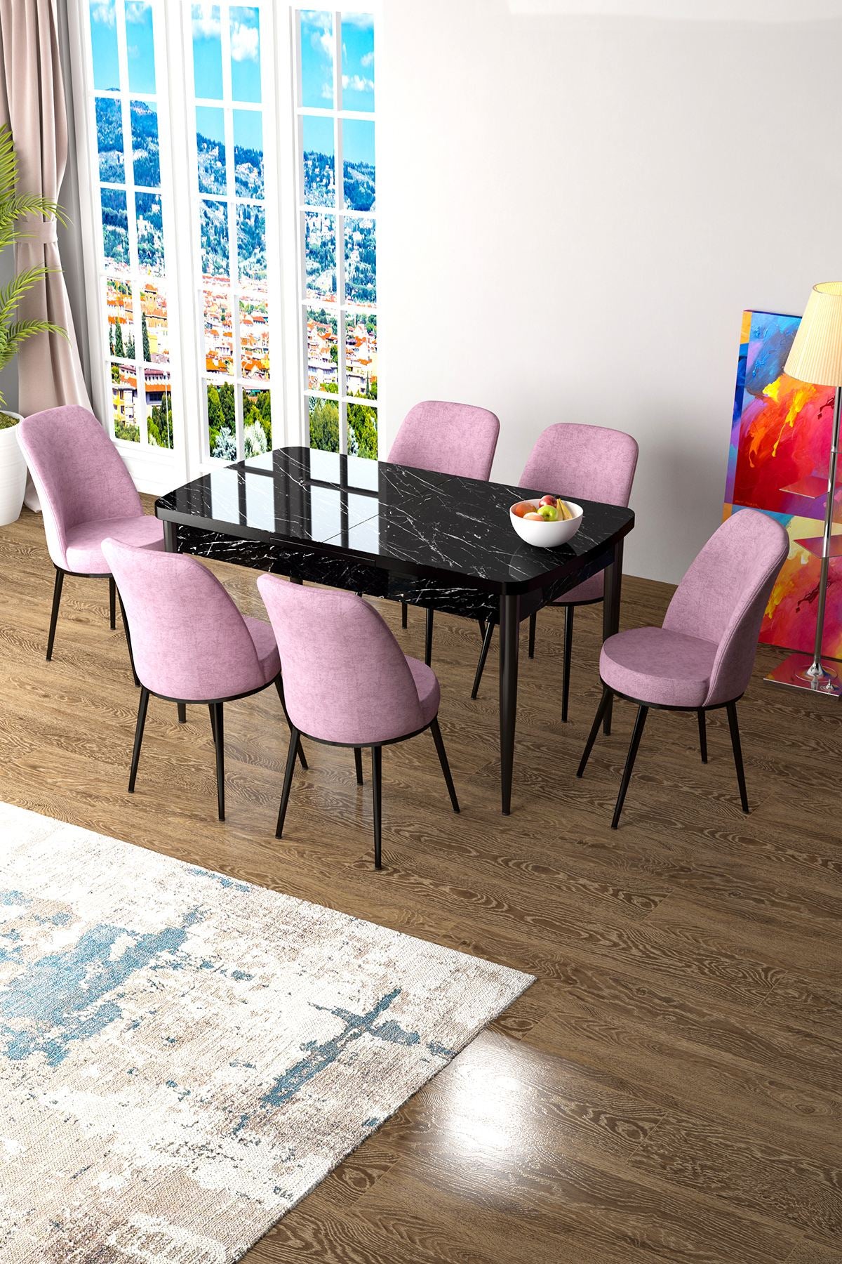 Conjunto de mesa de jantar extensível e cadeiras (7 peças) – 132 cm a 170 cm (mesa) – Preto Mármore e Rosa – MDF e metal