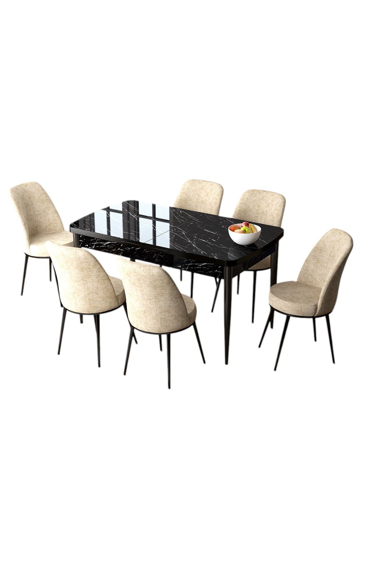 Conjunto de Mesa de Jantar Extensível e Cadeiras – 132 cm a 170 cm – Preto Mármore e Creme – MDF e Metal