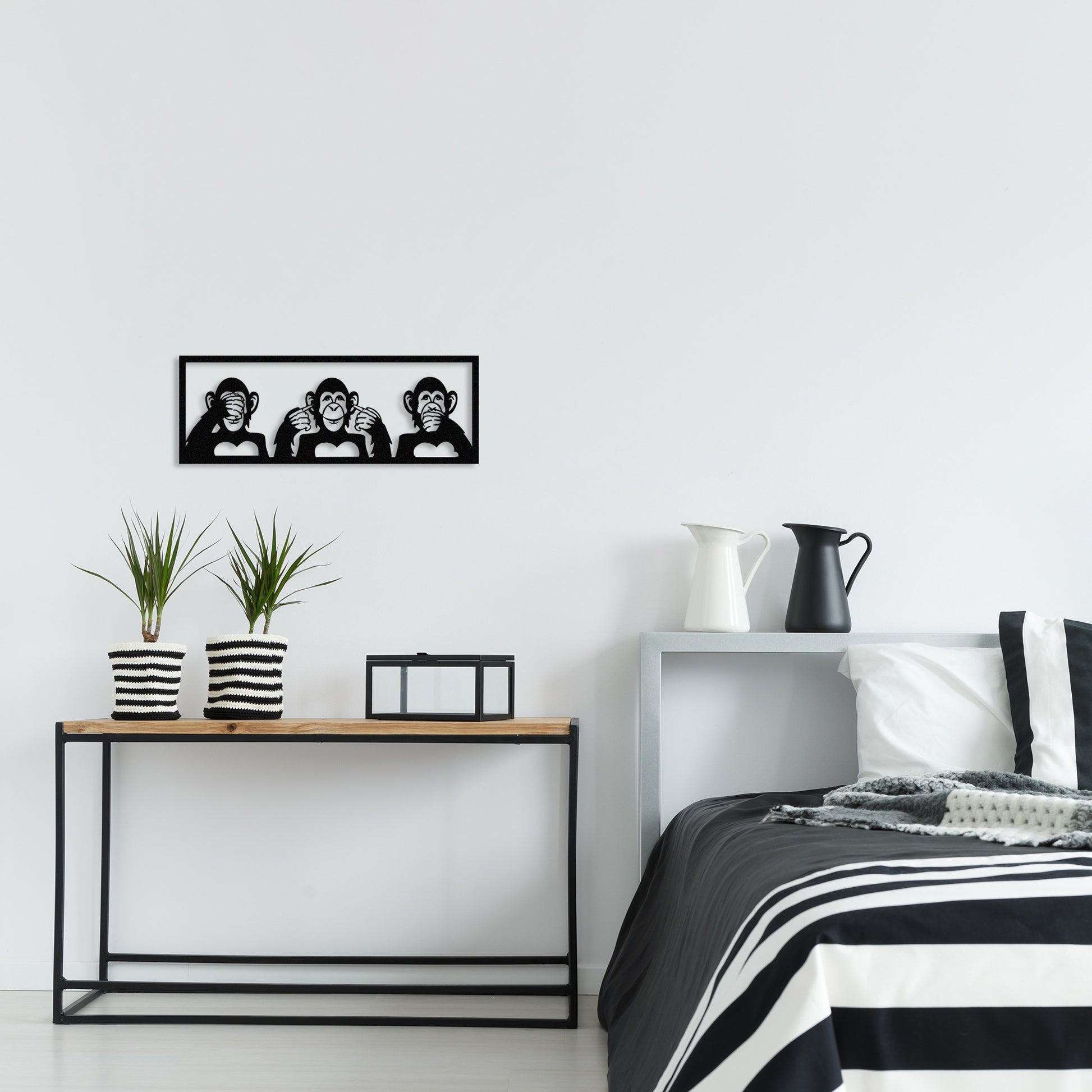 Este acessório decorativo é ideal para salas de estar, quartos, escritórios ou qualquer espaço que necessite de um toque artístico especial. O acabamento em metal preto confere um ar contemporâneo e elegante, enquanto o design dos três macacos adiciona um elemento simbólico e cultural único.
