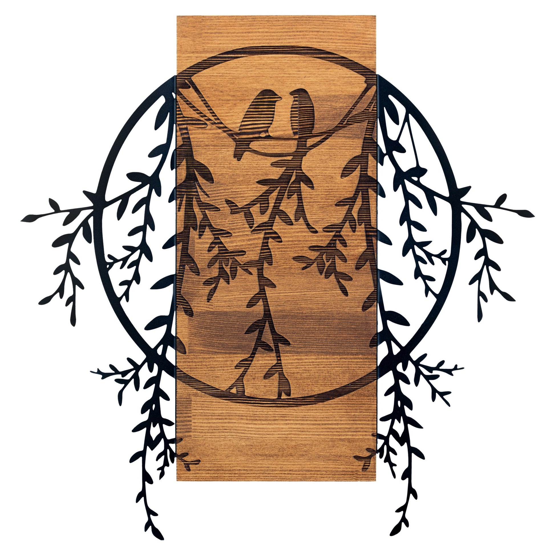 Pássaros Apaixonados 2 – Acessório Decorativo de Parede em Metal, Moldura de Madeira Nogueira, Preto, 63,3 x 65 cm