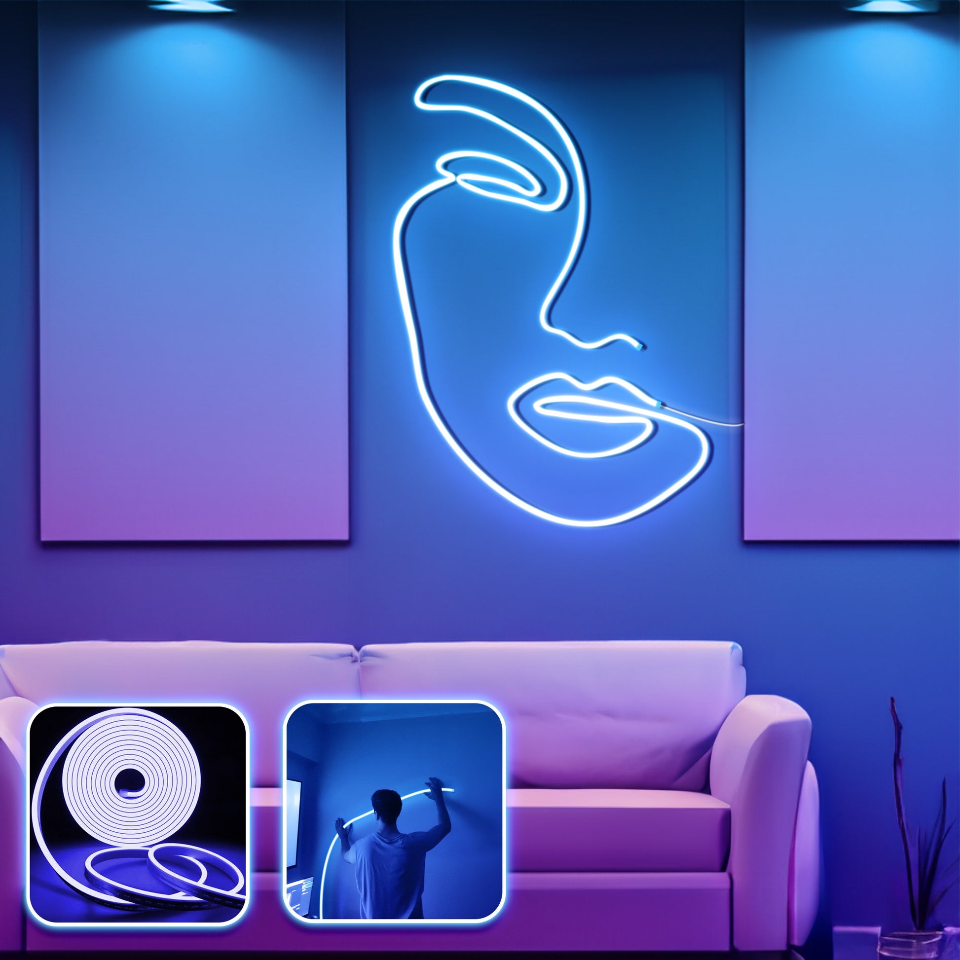 A cor azul vibrante das tiras de neon adiciona um elemento ousado e chamativo ao seu espaço. Se você deseja criar uma atmosfera relaxante ou fazer uma declaração com sua decoração, essa cor azul elevará instantaneamente o visual de qualquer ambiente.