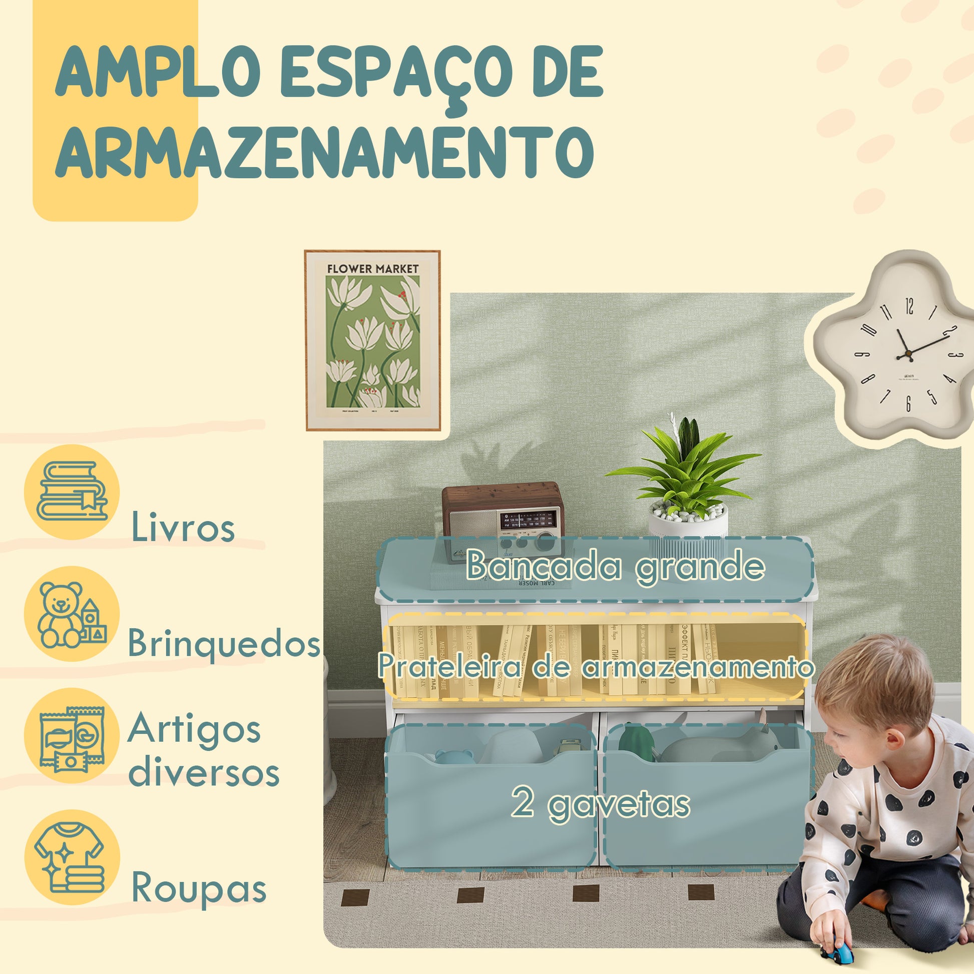 O organizador possui uma ampla bancada, prateleira aberta e 2 gavetas para uma organização eficiente. As medidas e a cor branca e madeira tornam-no versátil e adequado para qualquer ambiente. Fabricado em MDF resistente, com cantos arredondados para segurança. Perfeito para quartos infantis, salas de jogos e áreas de lazer. Montagem fácil com instruções inclusas.