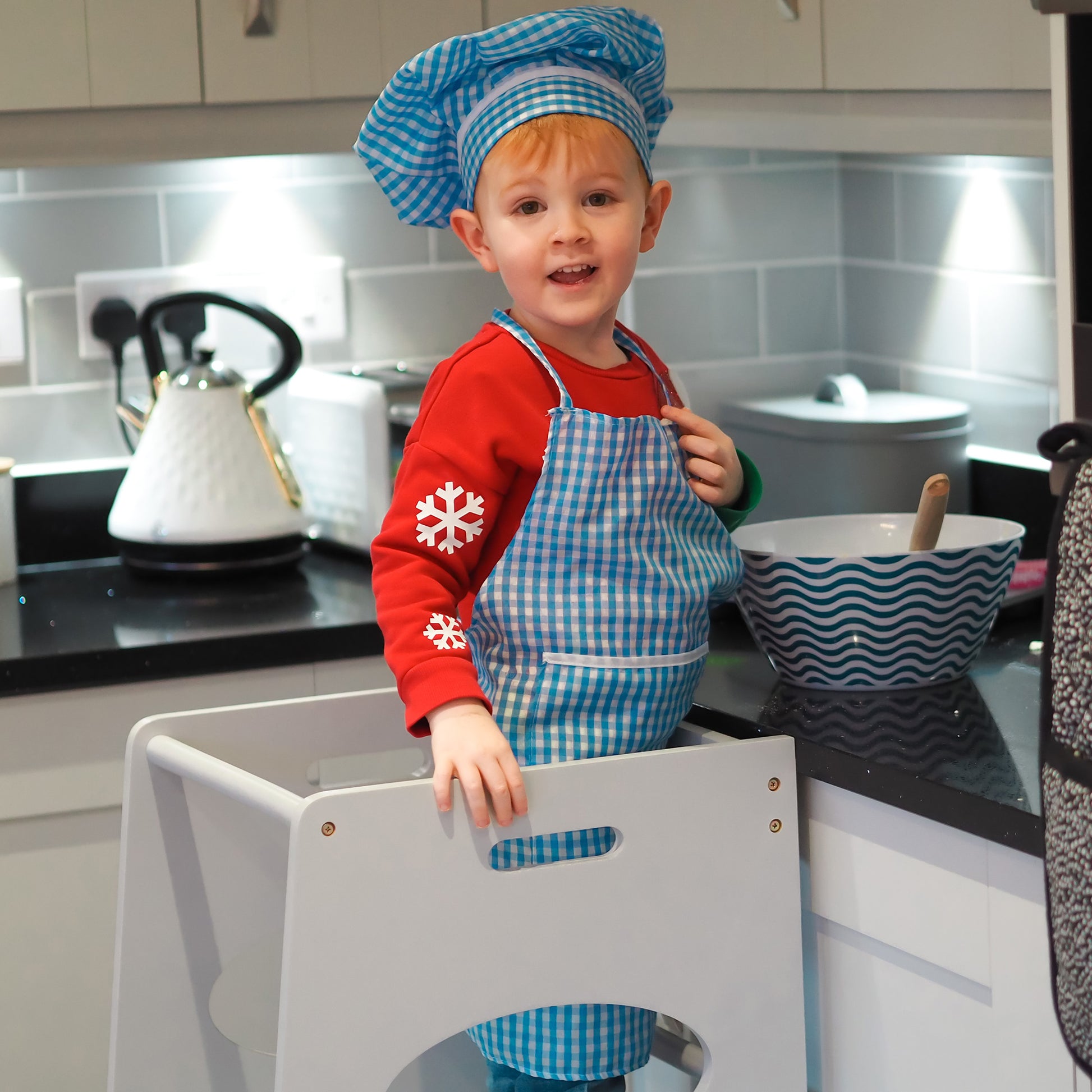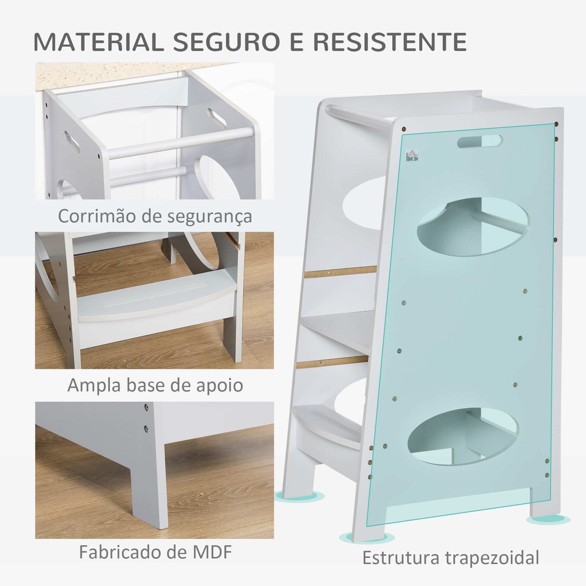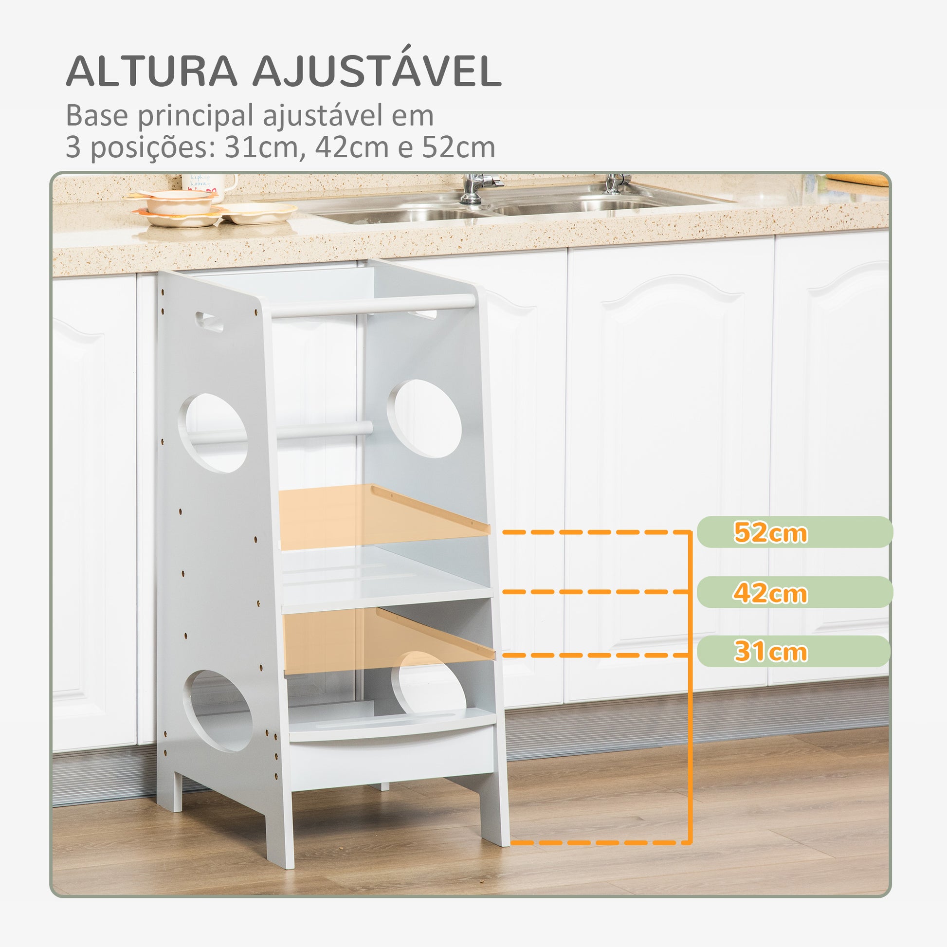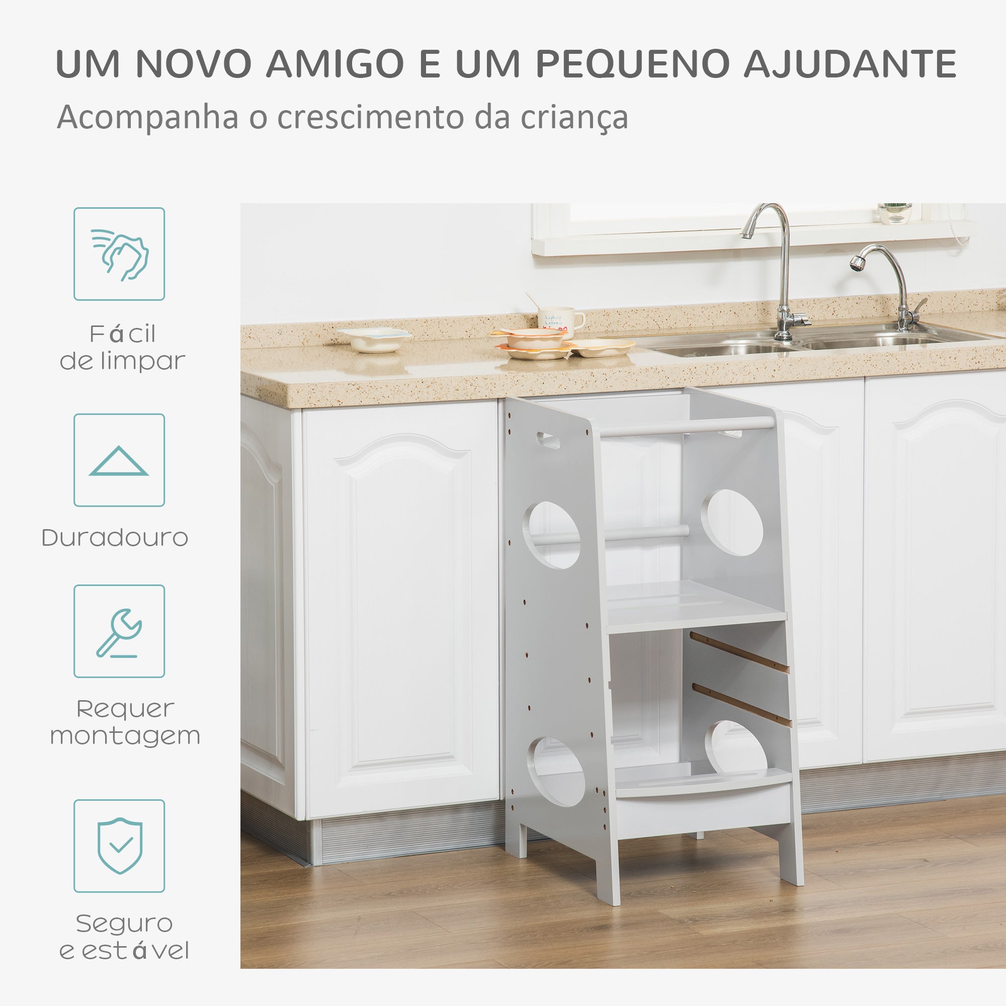 - Medidas: 40x50x90 cm, com degrau superior ajustável em 3 posições para se adaptar à altura das crianças.