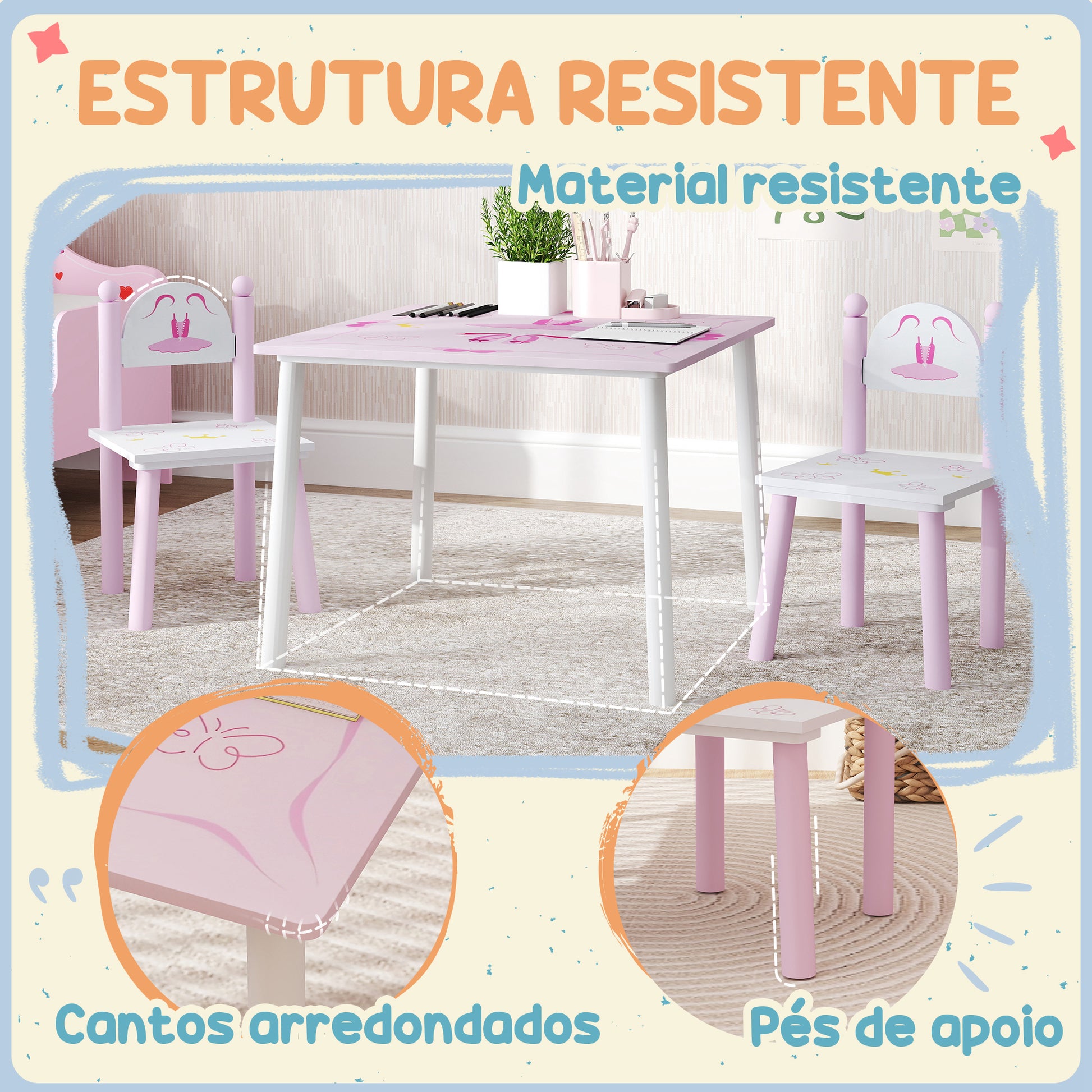Proporcione um espaço encantador e seguro para a diversão das crianças com este conjunto de mesa e cadeiras em tons de rosa e branco.