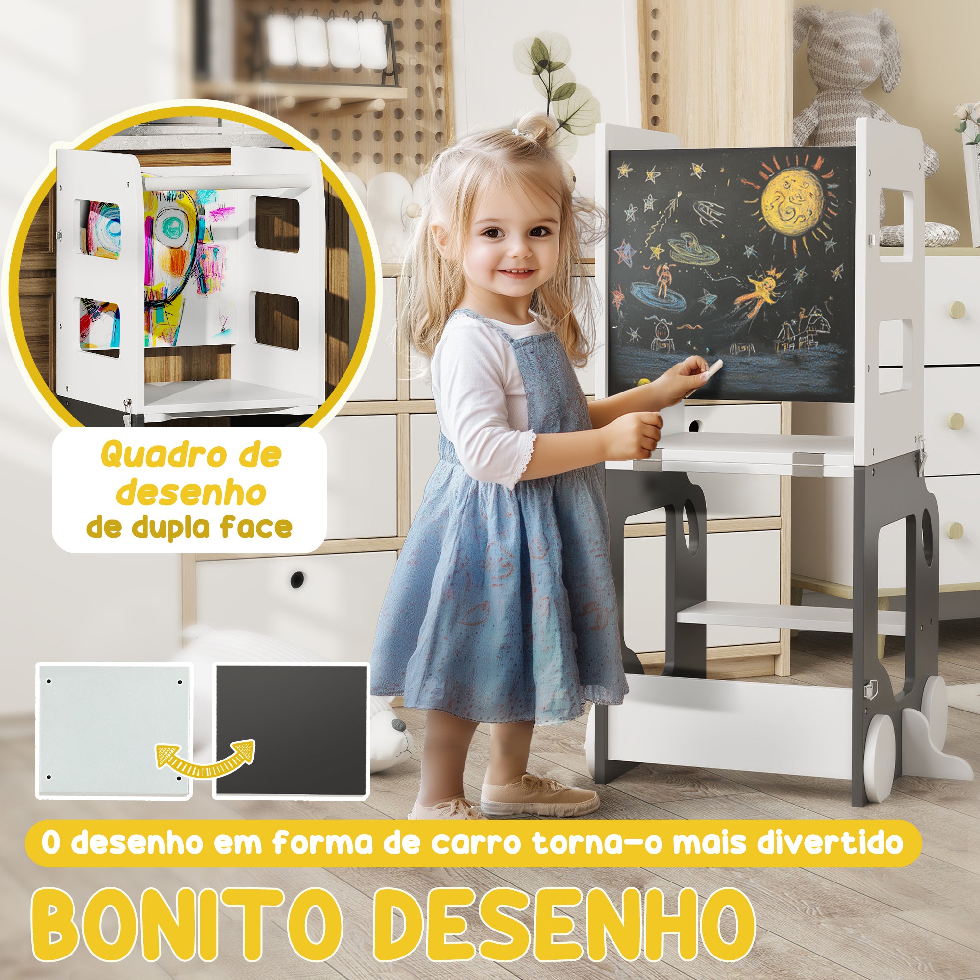 Torre de Aprendizagem Multifuncional 4 em 1 – 58x46x92 cm – Branco e Cinza – MDF e madeira de pinho