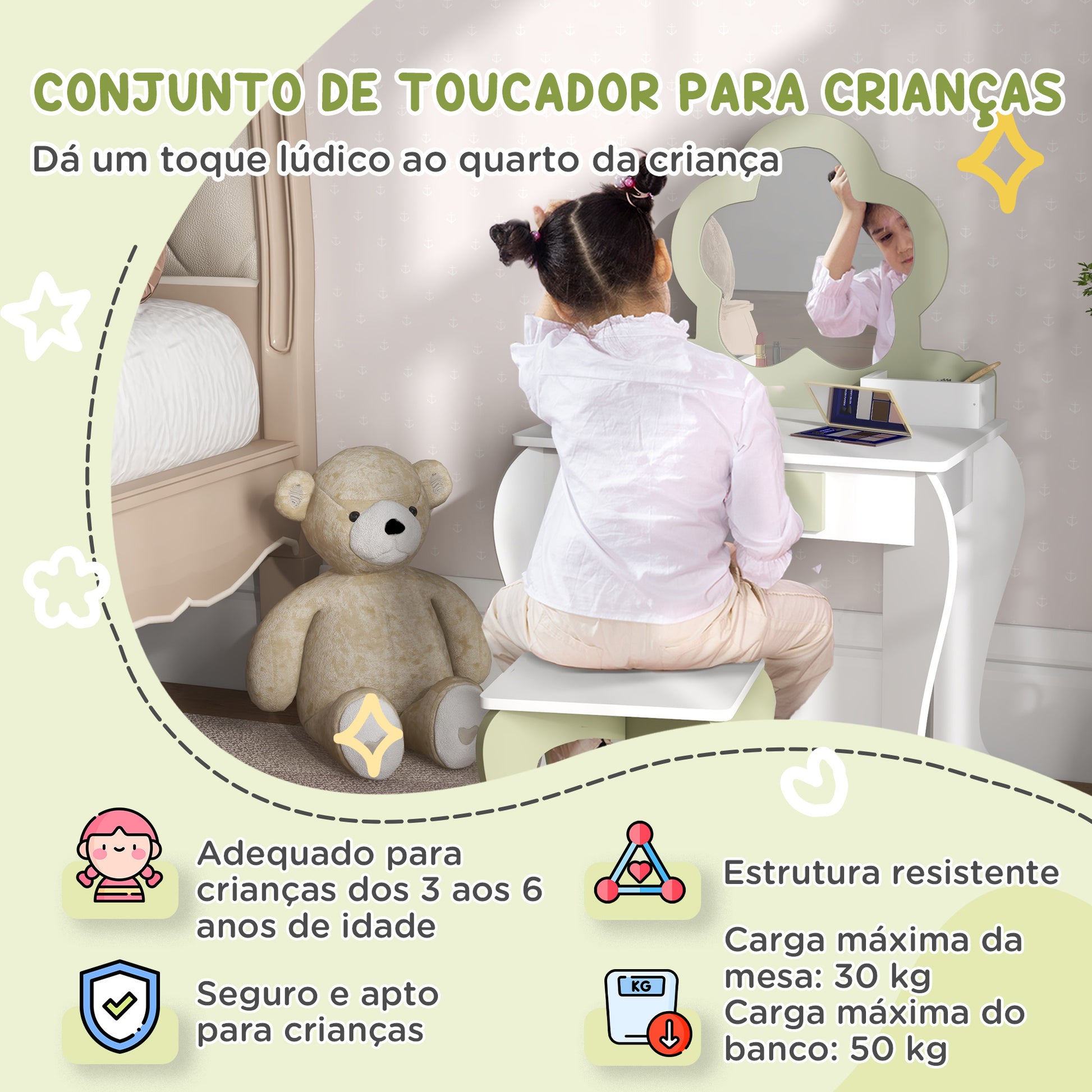 Toucador para Crianças – 55x34x87,5 cm – Branco e Verde Pastel – MDF e Acrílico