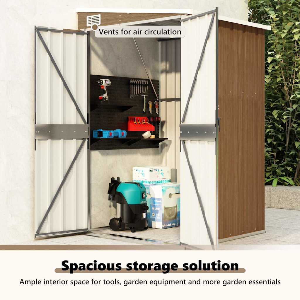 Por ser construído em aço galvanizado e metal, o galpão requer manutenção mínima e é muito durável. As portas de abertura dupla na frente permitem fácil entrada e saída. A maçaneta de plástico com trava garante a segurança do seu item. Além disso, a água da chuva é drenada automaticamente do telhado graças ao seu design inclinado.