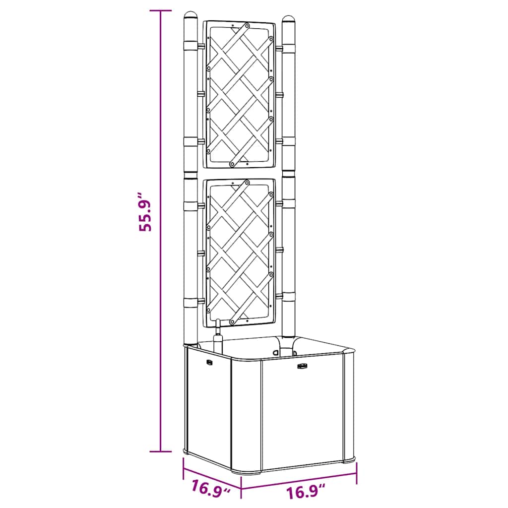 A treliça embutida oferece um excelente suporte para plantas trepadeiras, tais como ervas, tomates, feijões, etc. Feita de plástico robusto resistente aos raios UV, clima e geada, é adequada para utilização interna e externa. O design assemelha-se a uma estrutura de vime muito real. O material é lavável e fácil de limpar. Esta caixa pode regar automaticamente as plantas, que absorvem a humidade a partir do seu reservatório de água de 35 L. Possui orifícios de escoamento para evitar o excesso de água. O indicador de nível está incluído.