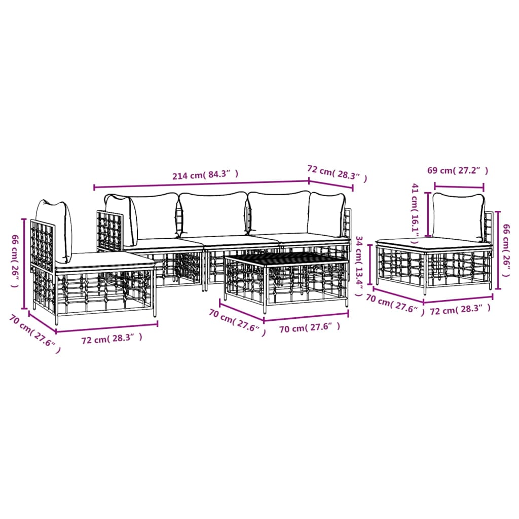 6 pcs conjunto lounge de jardim c/ almofadões vime PE antracite