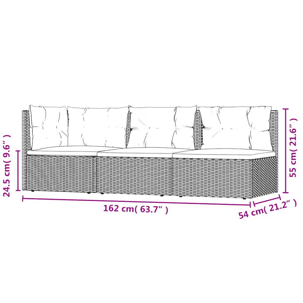 3 pcs conjunto lounge de jardim c/ almofadões vime PE cinzento