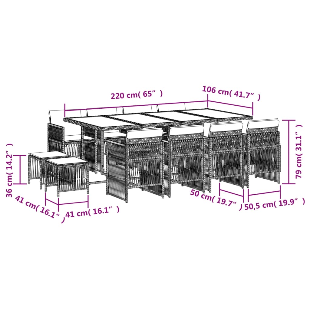 13 pcs conjunto de jantar p/jardim com almofadões vime PE preto