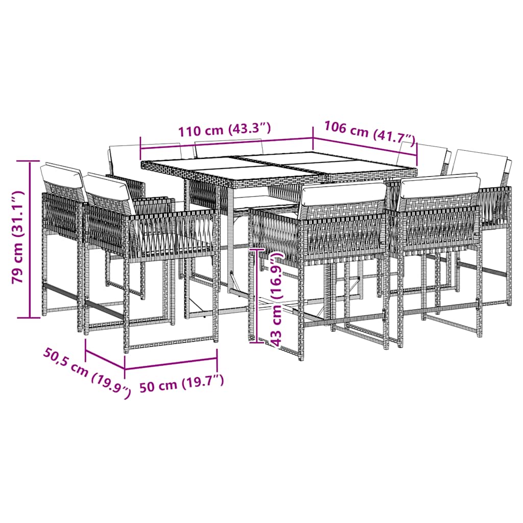 9 pcs conjunto de jantar p/ jardim c/ almofadões vime PE preto