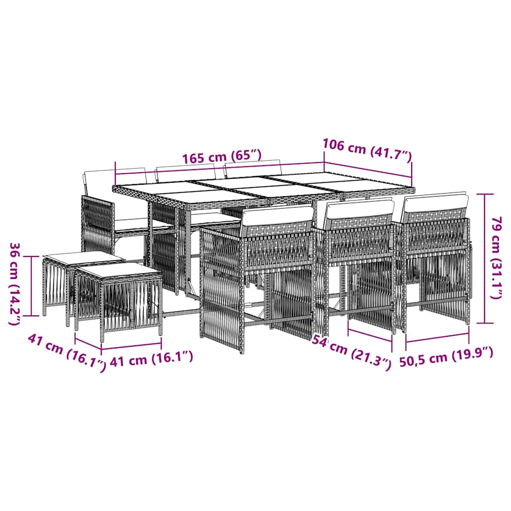 11 pcs conjunto jantar p/ jardim c/ almofadões vime PE castanho