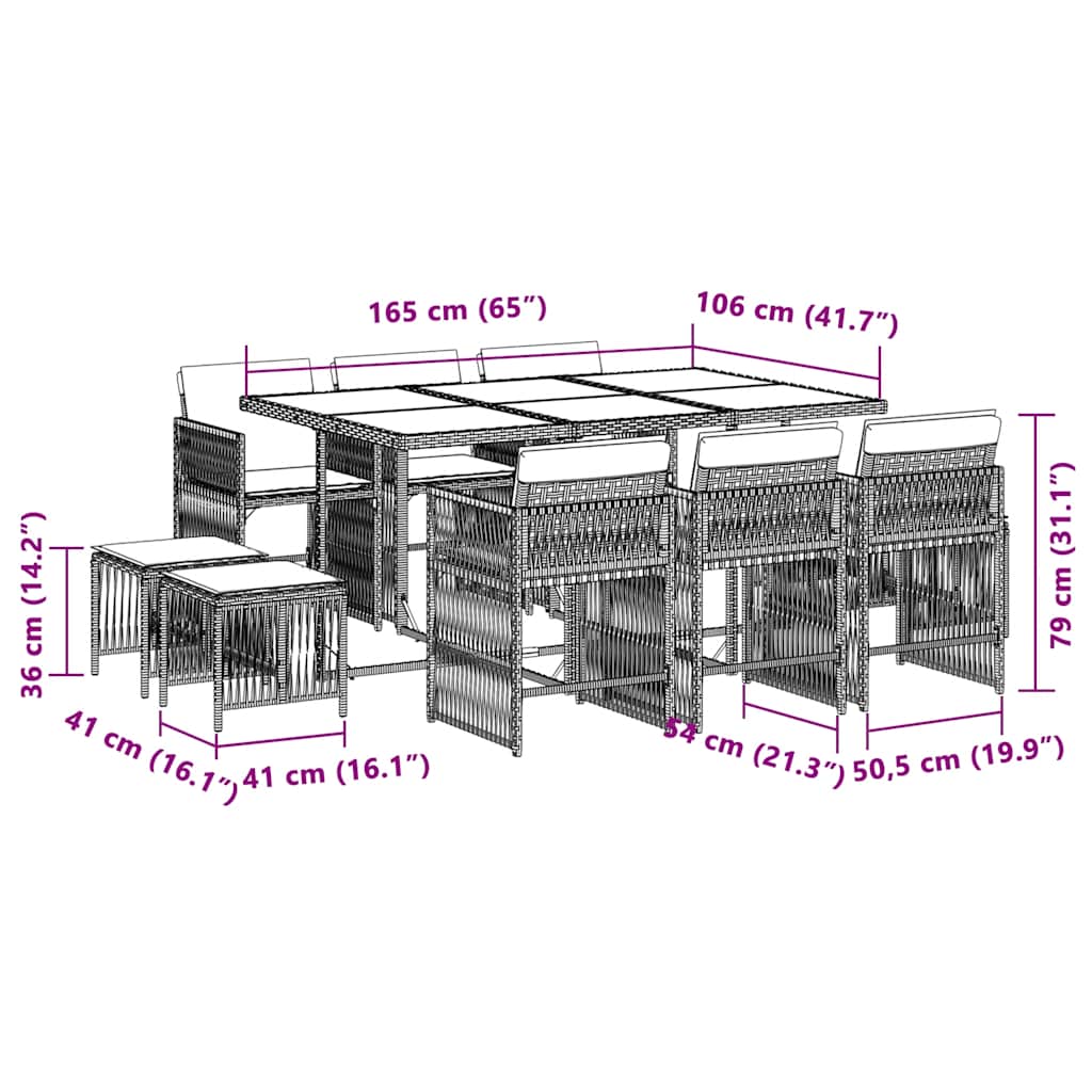 11 pcs conj. jantar jardim c/ almofadões vime PE bege misturado