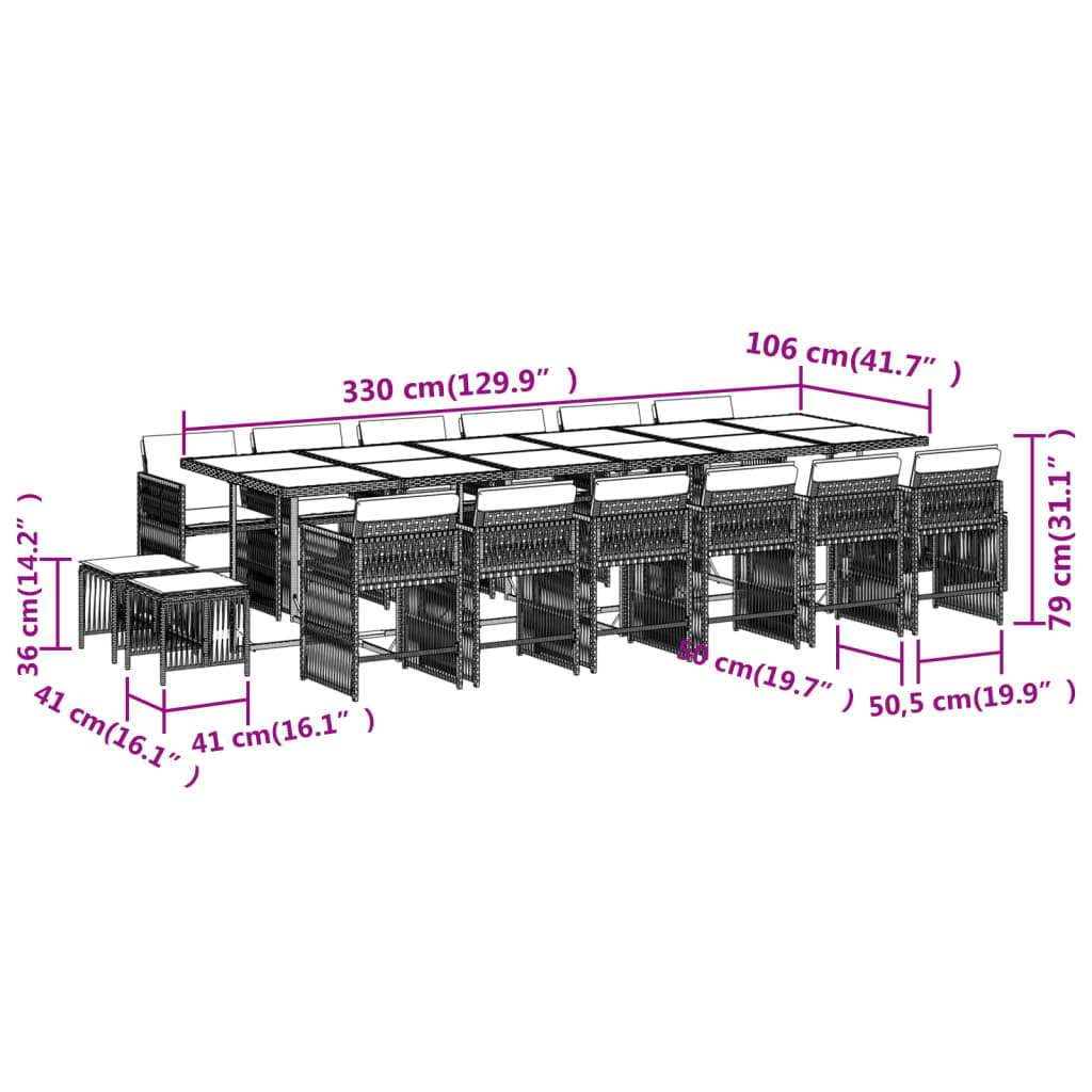 17 pcs conjunto de jantar p/ jardim c/ almofadões vime PE bege